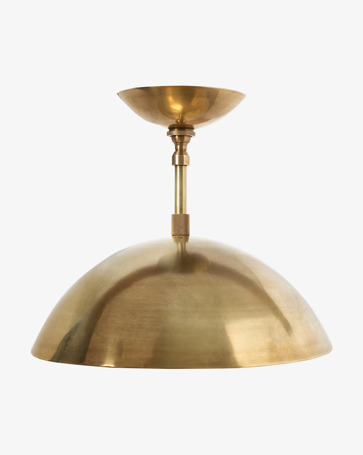 Our Aldorno Flush Mount strikes a balance between pronounced lines and elegant curvature. Crafted from brass, the flush mount makes a soft statement in lighting designs anywhere in the home. A wide round shade brings a nuanced shapeliness and classic feel to its simple form.