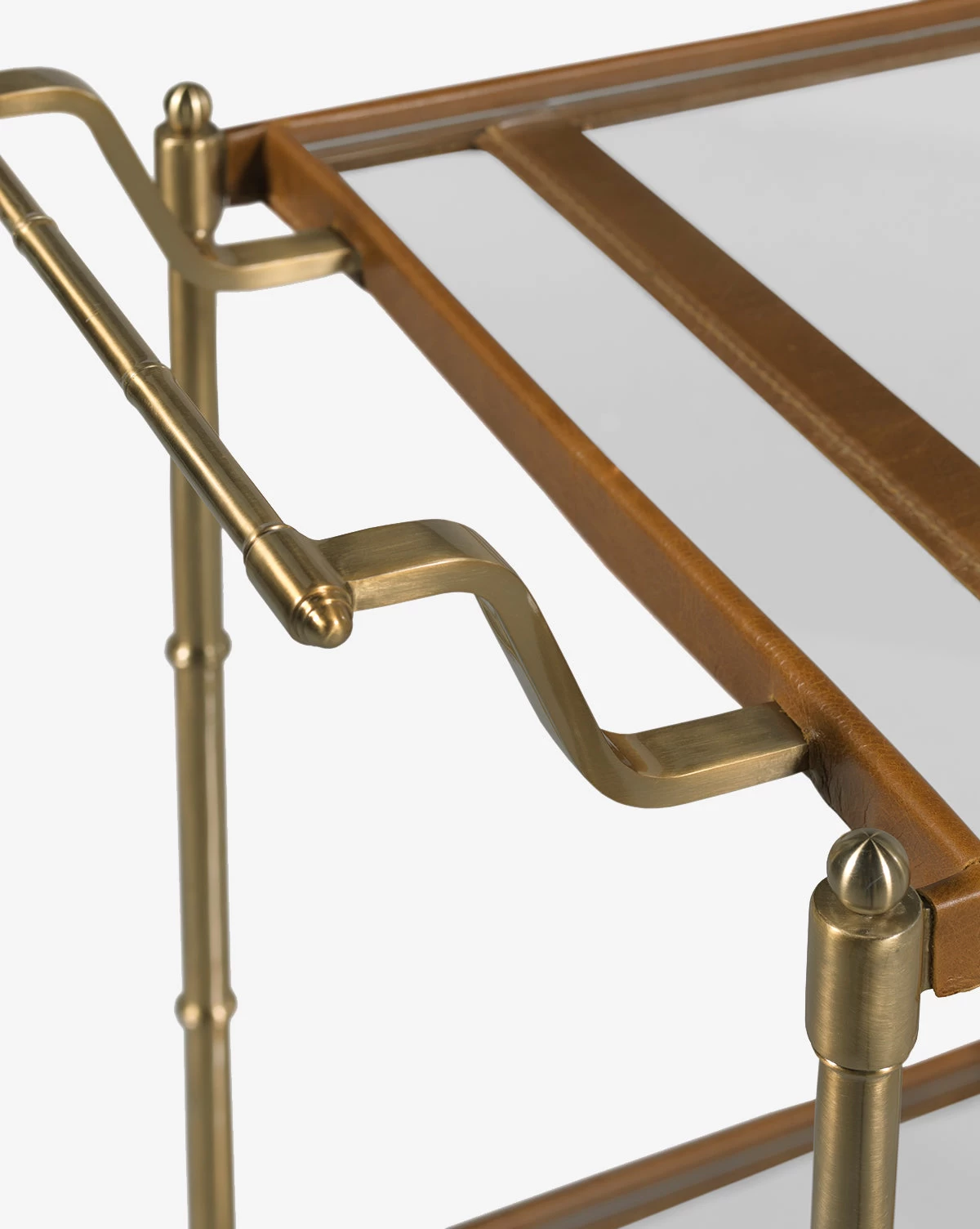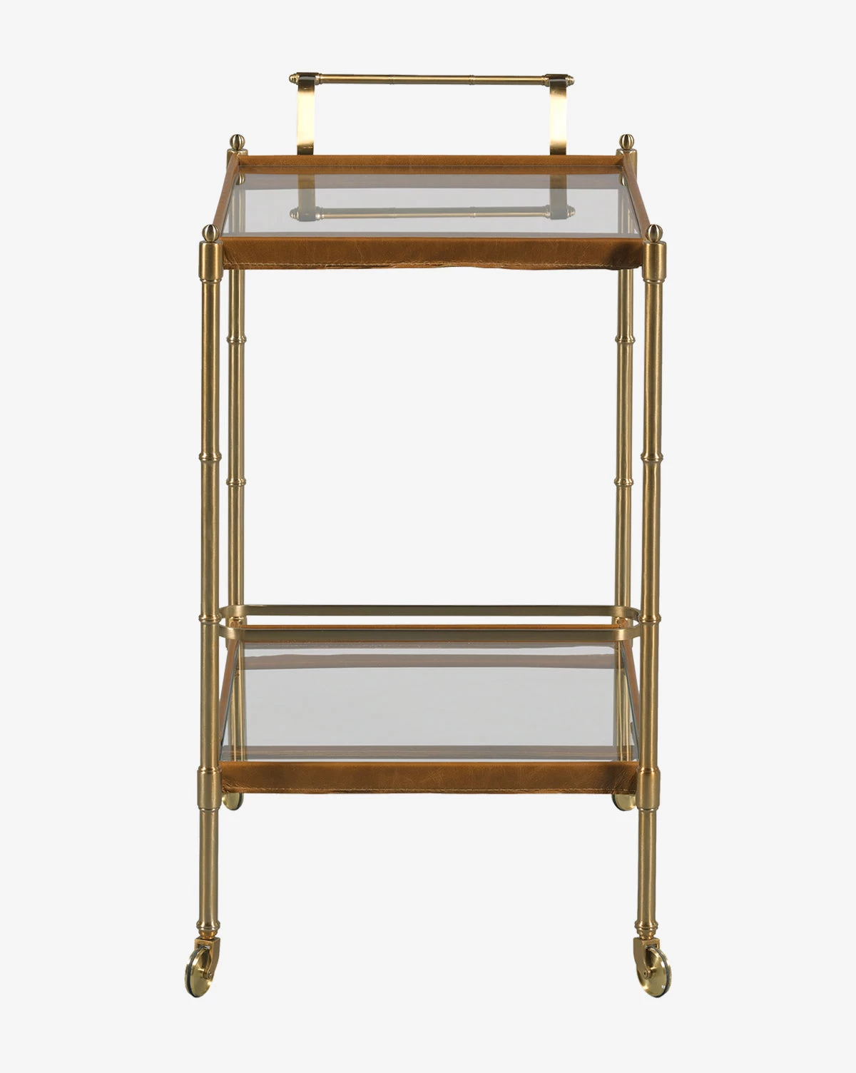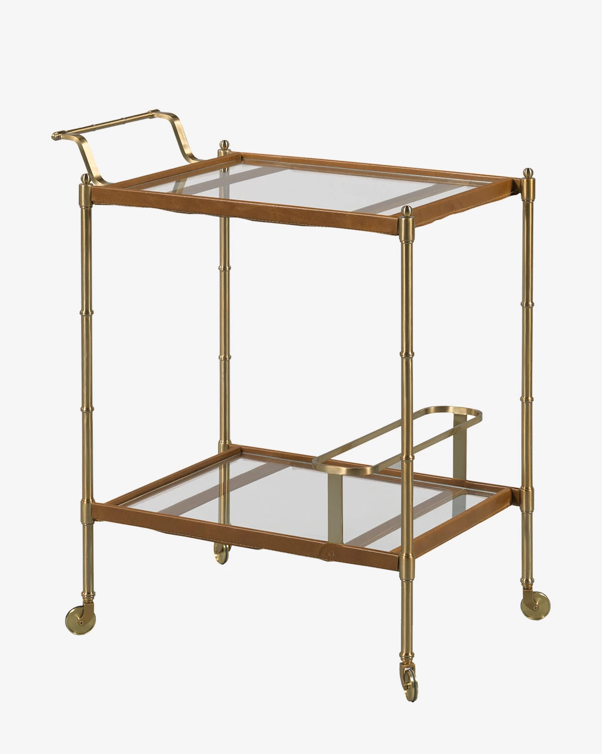 Inspired by bar carts from the English Regency, the Bexley Bar Cart is sleek and thoughtfully designed. Its brass frame features leather accents to hold the tempered glass shelves. Complete with functional details, this bar cart is a beautiful addition to your hosting set up.