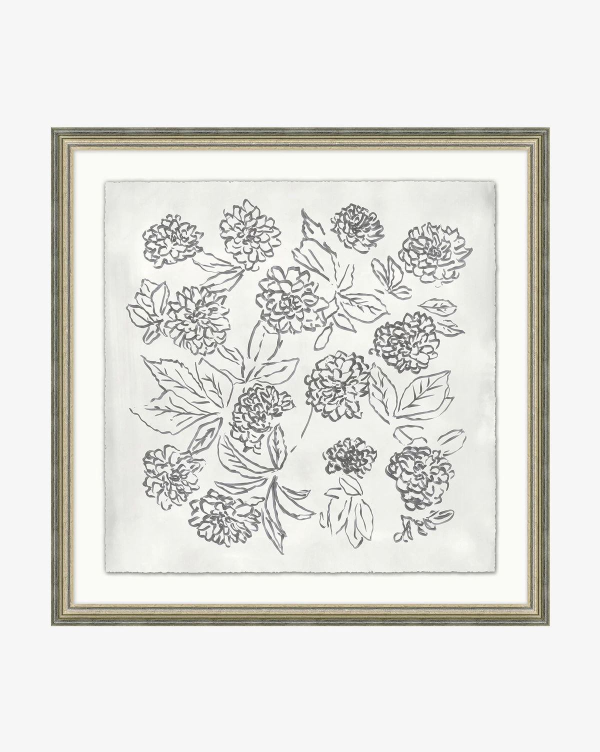 In a monochromatic palette featuring a delicate yet confident sketch of blossoms, Blossom Sketch 4 is incredibly charming. A giclee print on watercolor paper, this piece is deckled and floated on mat in a silver-leaf etched frame.