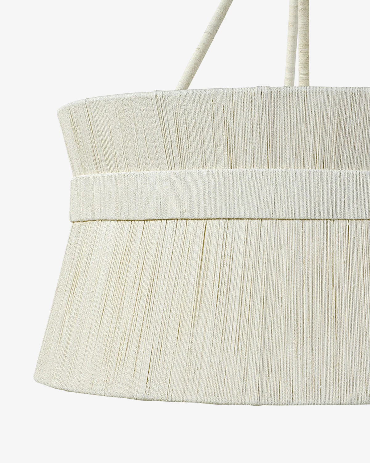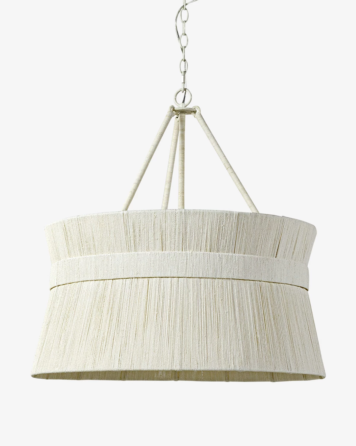 Handwoven rope and metal combine in the stunning Cassidy Chandelier. Made with abaca fiber rope that is hand-braided and woven over a powder coated metal frame, this chandelier has a tucked waistline that brings sophisticated design detail to the room. Suspended by abaca wrapped metal rods and a cream-finished metal chain, the Cassidy Chandelier creates a look that is both rustic and elegant.