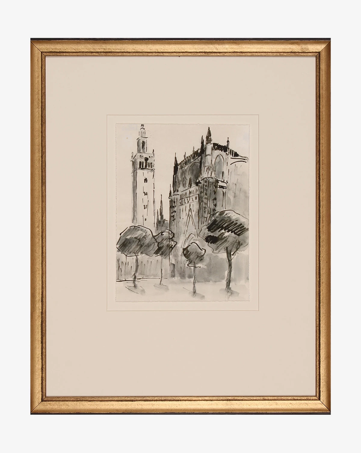 Sketched and painted with the beauty of watercolor, our Castle Sketch adds dimension with its tonal use of black. Enhanced with artist applied texture, this piece brings interest to your space with its wide mat design and stunning gold hued frame.