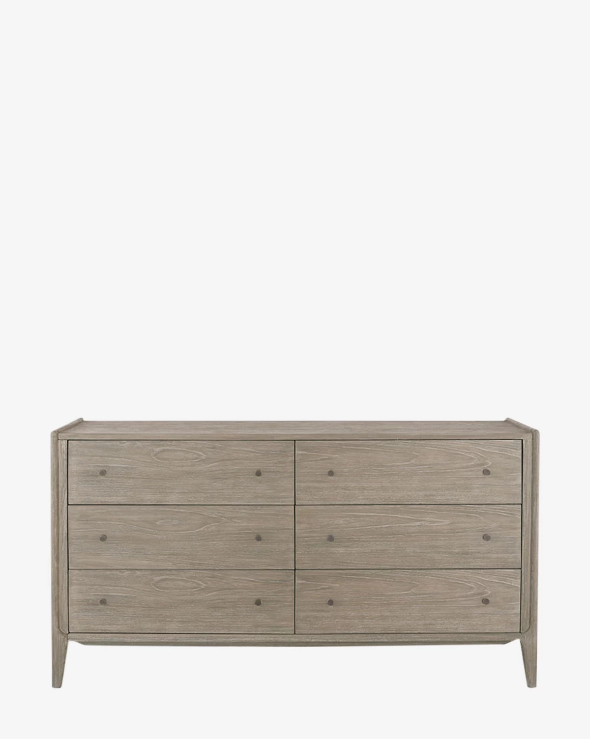 With a frame inspired by mid-century design, the Chandler Dresser draws the eye with its clean silhouette and fawn finish. Crafted from teak, this casually approachable design features simple bronze pulls, lending a unique moment of visual contrast.