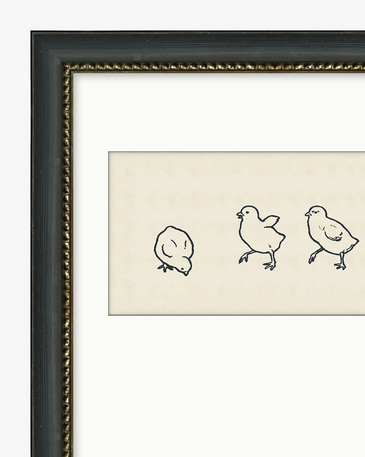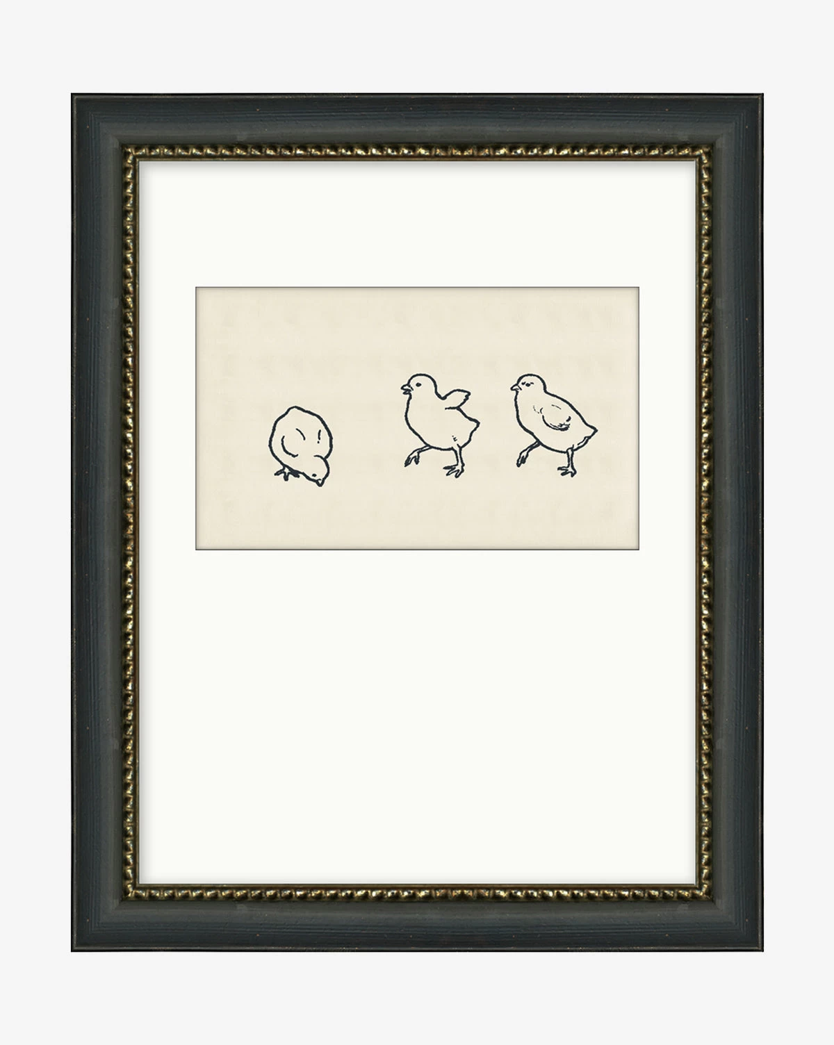 With three minimally sketched baby chicks, Chick Cut-Outs is a balanced and endearing piece for children’s bedrooms. Its offset layout and giclee print add refinement to its appearance. This piece tells a captivating story in a simple, line-drawn composition reminiscent of a children’s book.