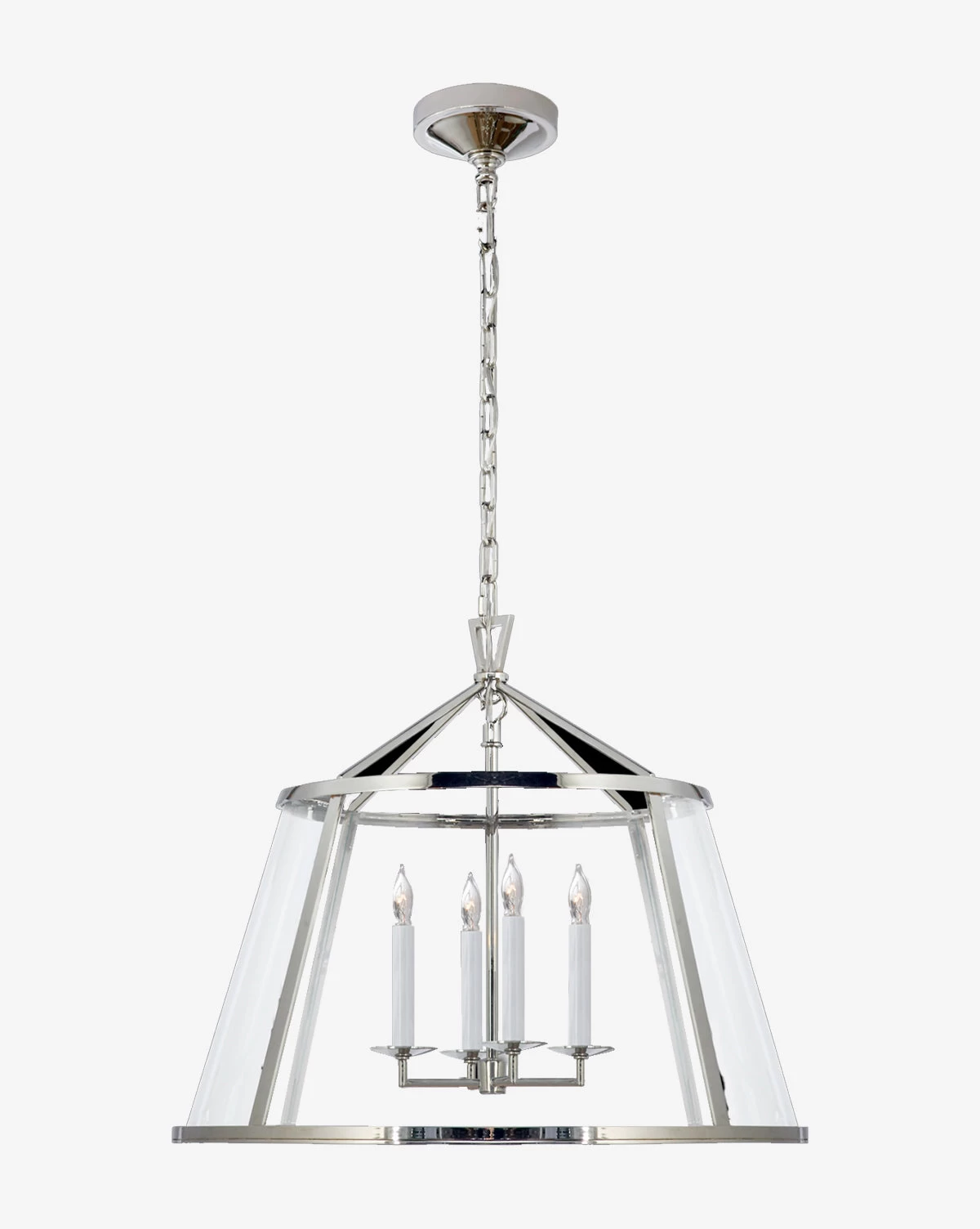 The Darlana 24â Pendant is inspired by the traditional lantern but given a modern update. Sleek lines and a clear glass shade surround a four bulb candelabra, making a contemporary pendant for the entryway, dining, or kitchen area.