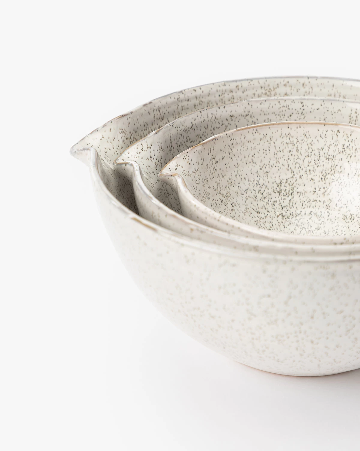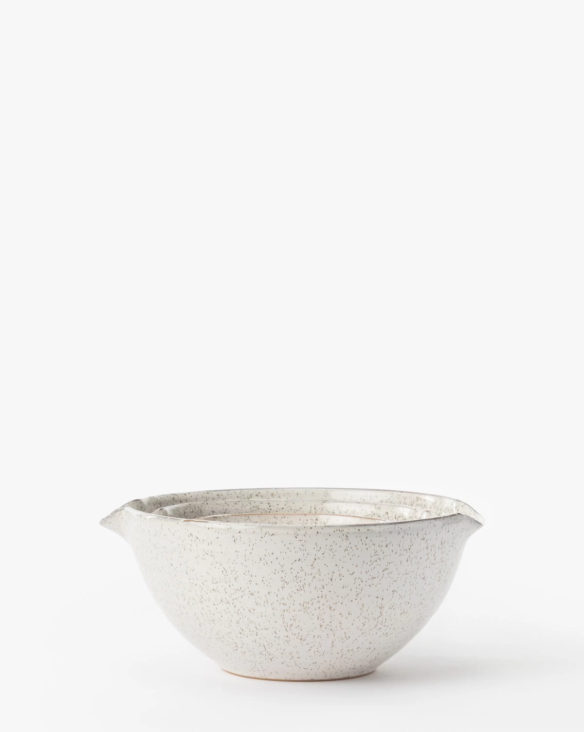 With a classic ceramic feel, the Decima Speckled Bowls invite your senses into the kitchen. The bowlâs small lips lend themselves to easy pouring and the cool, speckled glaze contributes to a calming aesthetic on your shelves or countertop.