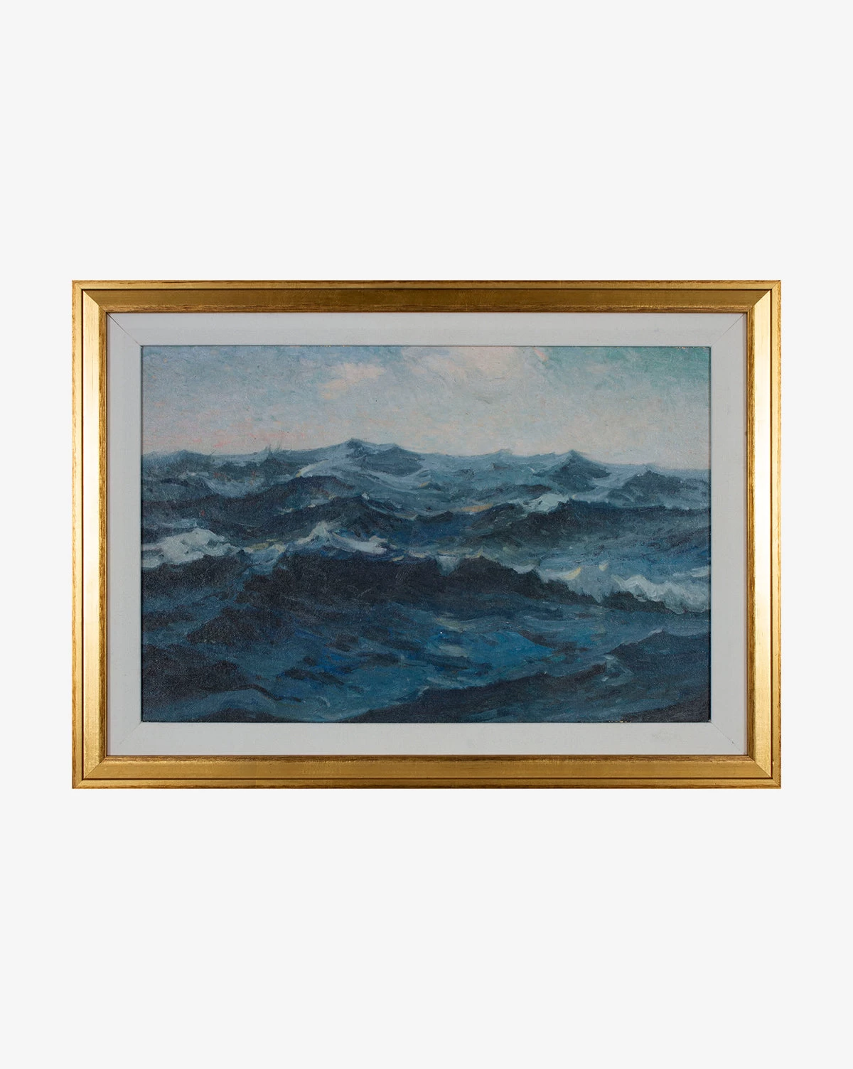 With moody tones and fine brushwork, Deep Blue Waters depicts a stormy sea. Captivating and dramatic, the piece displays a canvas transfer technique, allowing for gallery-quality artwork in your home, framed with gold wood. Â