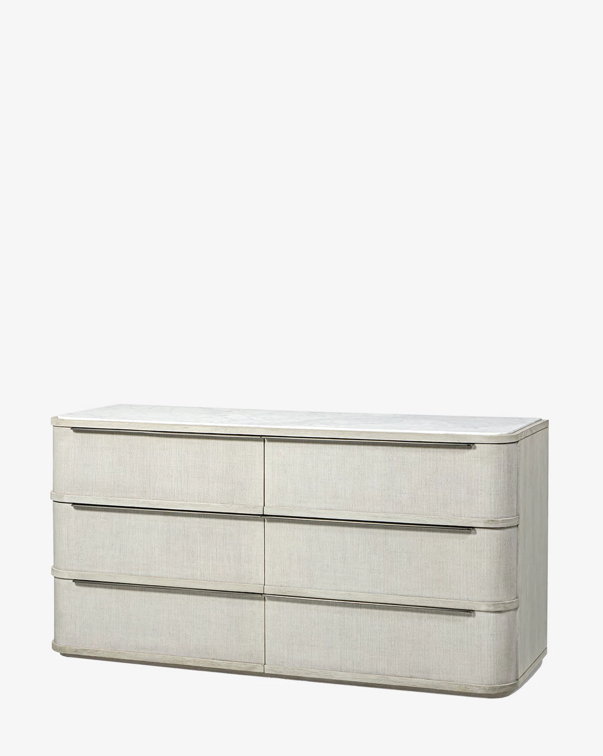 With elegantly mixed materials, the compelling yet neutral Deirdre Dresser elevates your home with its thoughtful details. Made from whitewashed wood with caning on the drawers, the dresserâs marble tabletop brings sleek and sophisticated texture to the piece.