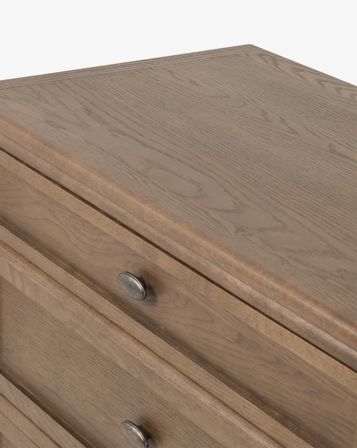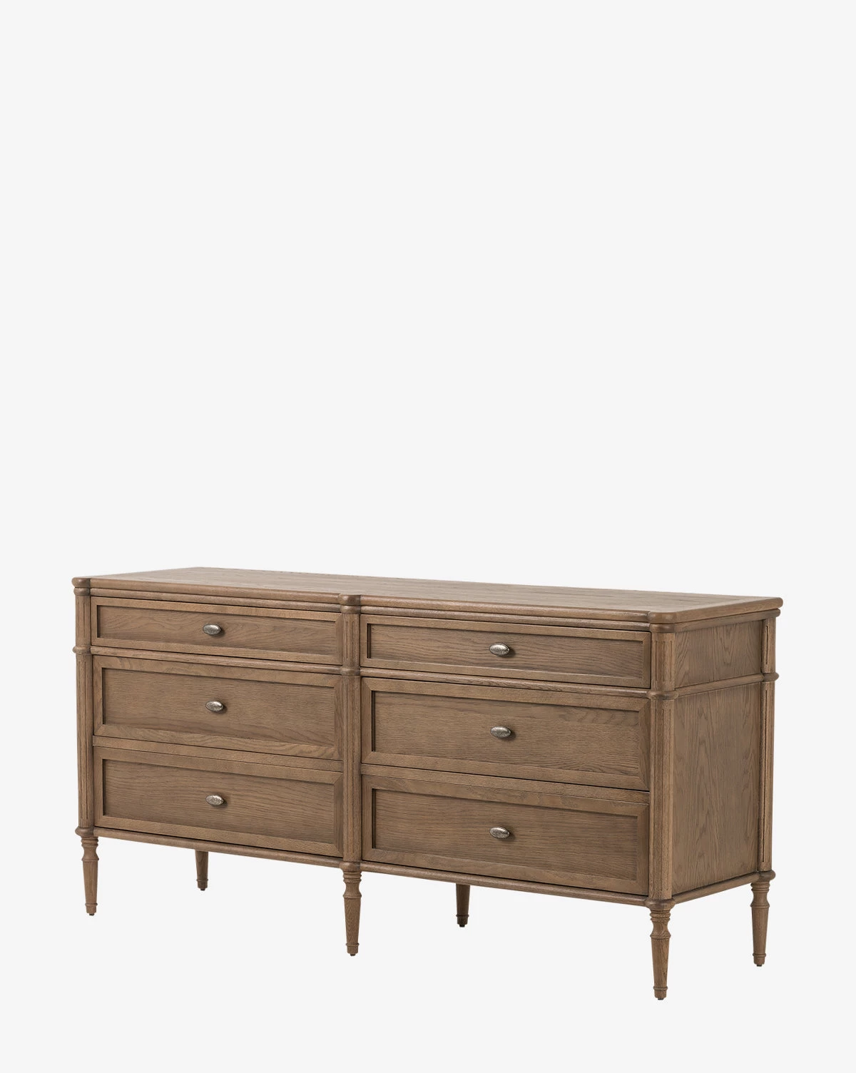 In an updated traditional design, the Dixon 6-Drawer Dresser draws the eye with its spindle legs and warm finish. Crafted from oak, this approachable design is finished with oval aged brass pulls, lending an elegant detail to your bedroom styling.