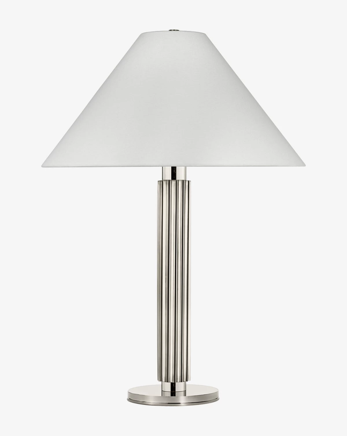 In three elegant finishes, the Durham Table Lamp brings classic and refined details to your spaces. Its tapered linen shade is complemented by a long, fluted metal body and circular base, creating a transitional and understated piece.