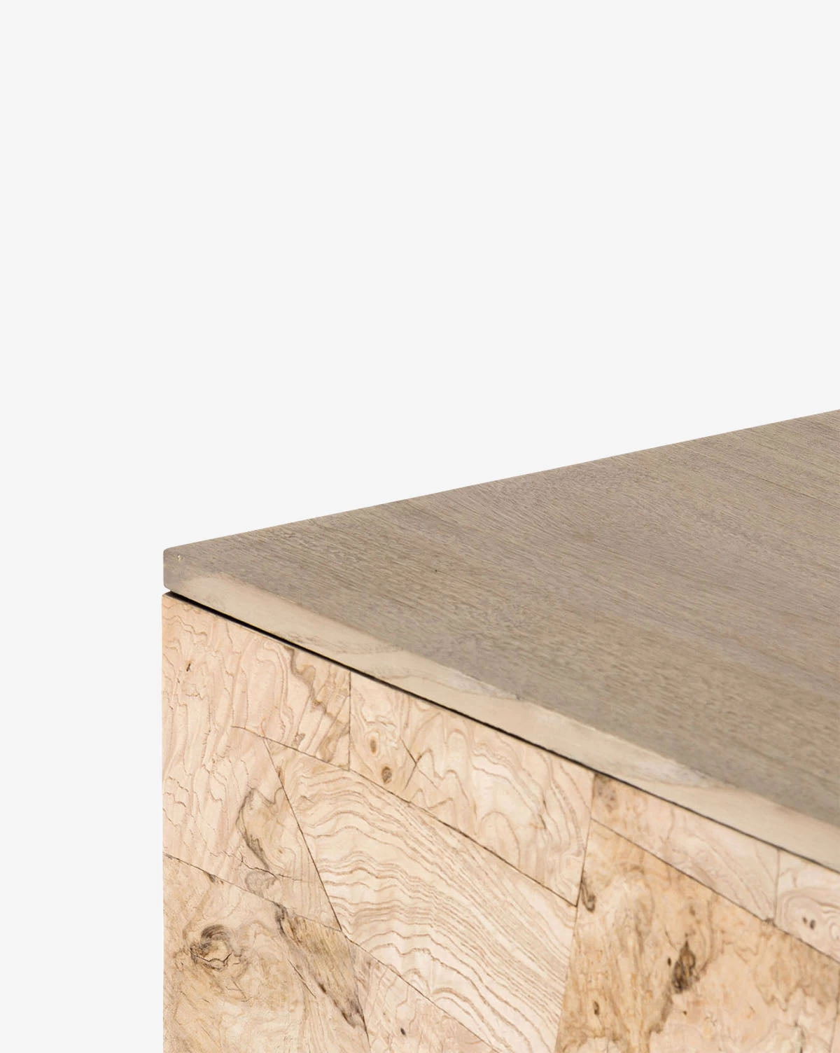 Elevated in both style and design, the Eisley Dresser makes a statement in your bedroom with its white-finished mahogany form and leveled up base. Its bleached burl drawer fronts are laid in a patchwork design, cut and placed by hand, and finished with a push-latch open for a clean, seamless look.