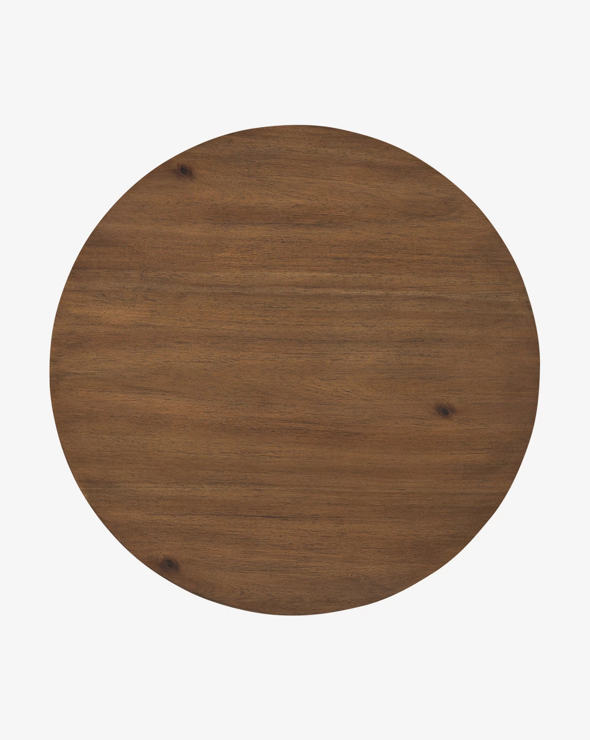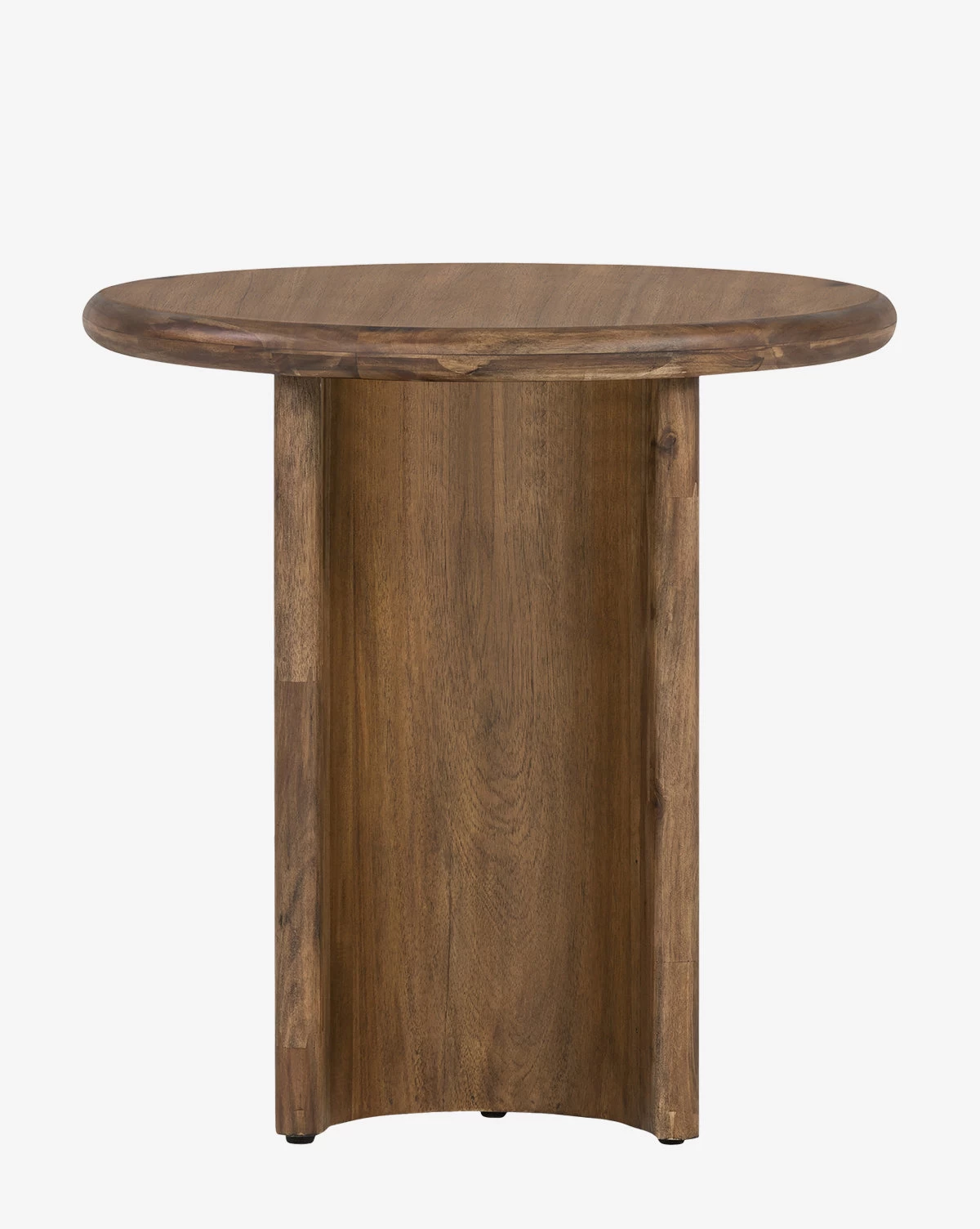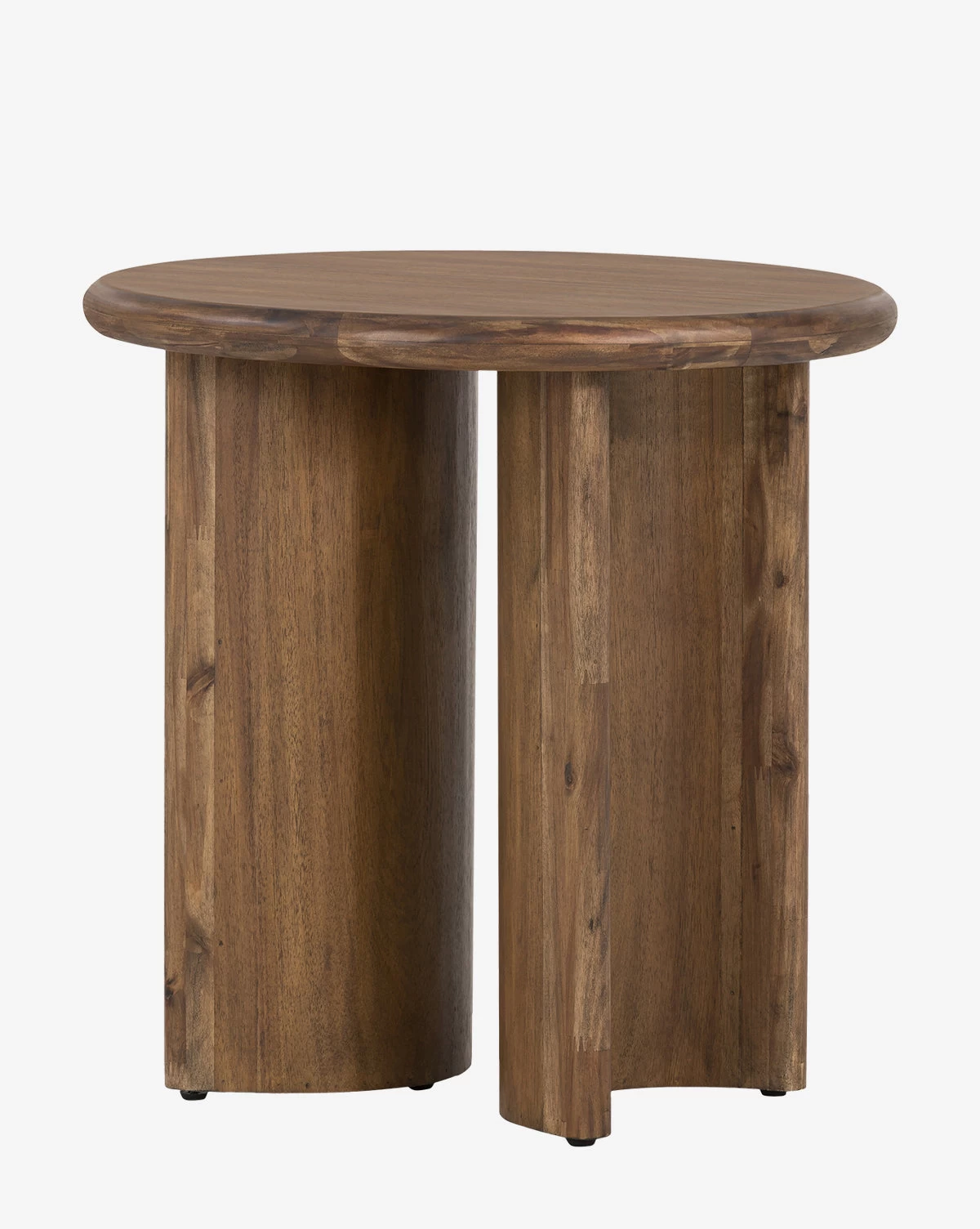 Crafted from acacia wood, the Eleazar End Table is a study in shape. With crescent-shaped legs that support the smooth, circular top, the end table brings its stately organic presence to your space. The coffee table is available in a rich brown or sandy finish.