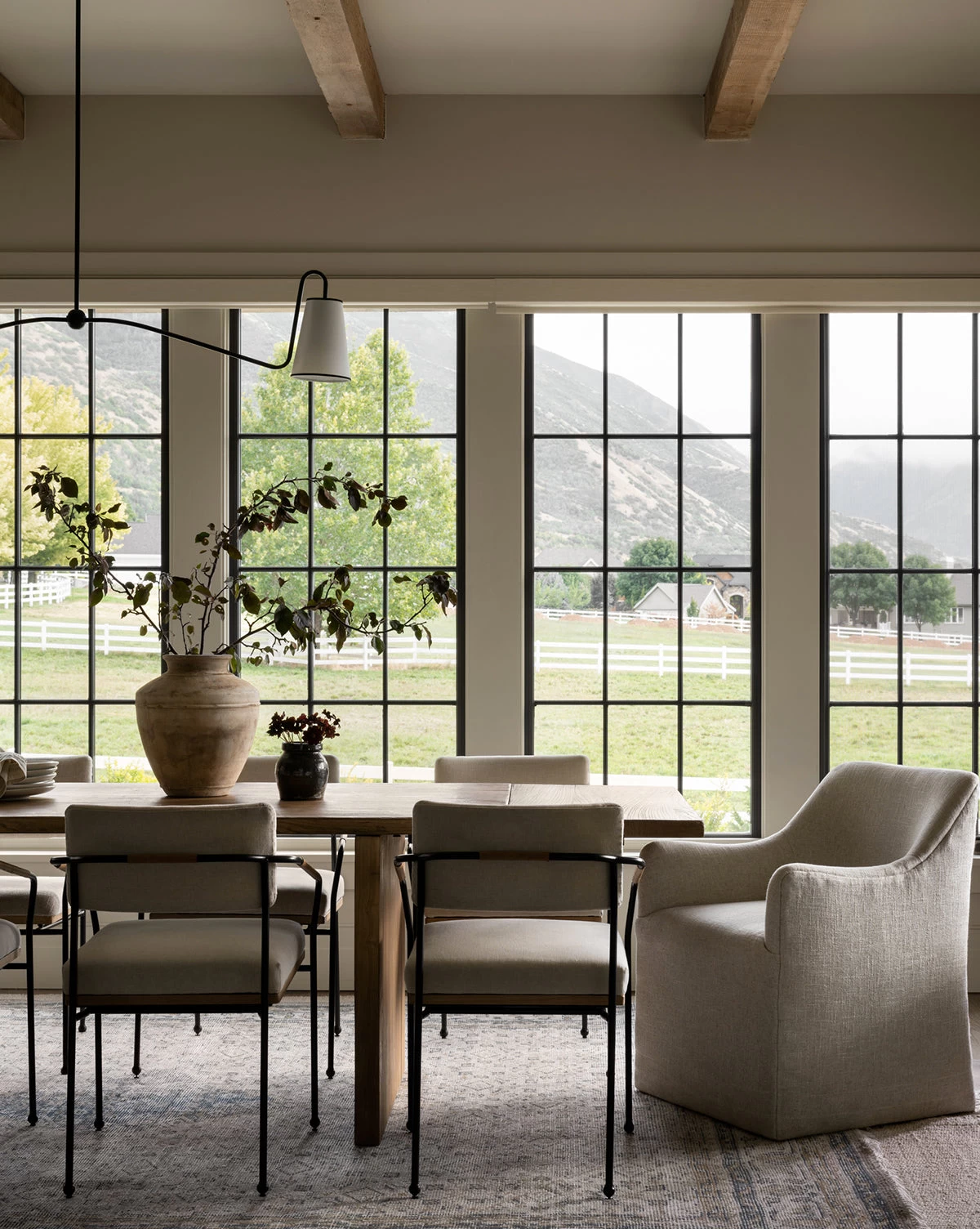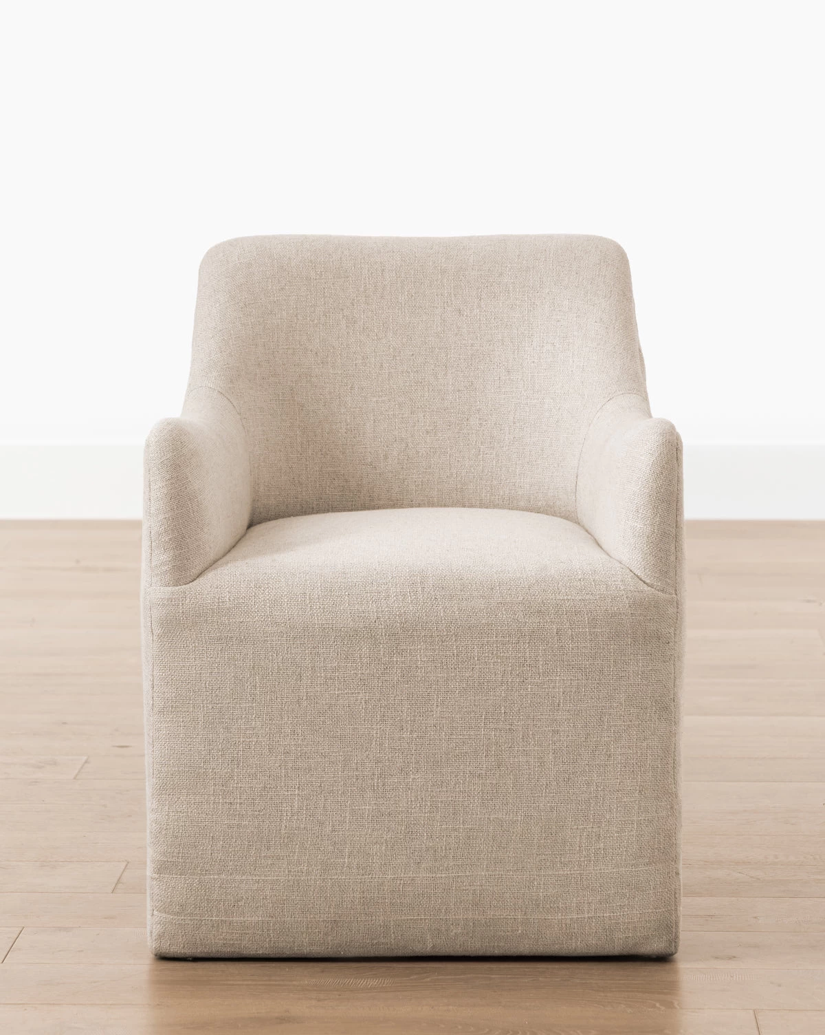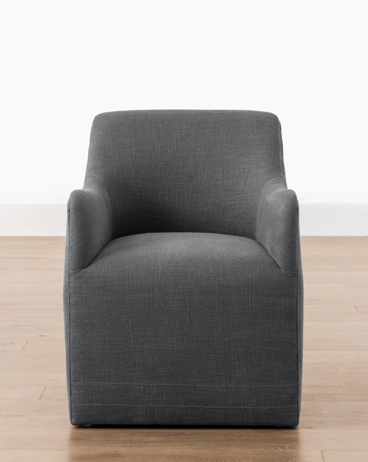Dramatic and poised, the Elton Dining Chair is upholstered with a linen blend, with elegant lines that bring sophistication to dining spaces. Its back fluidly extends into its armrests, creating an elongated look and elegant feel.