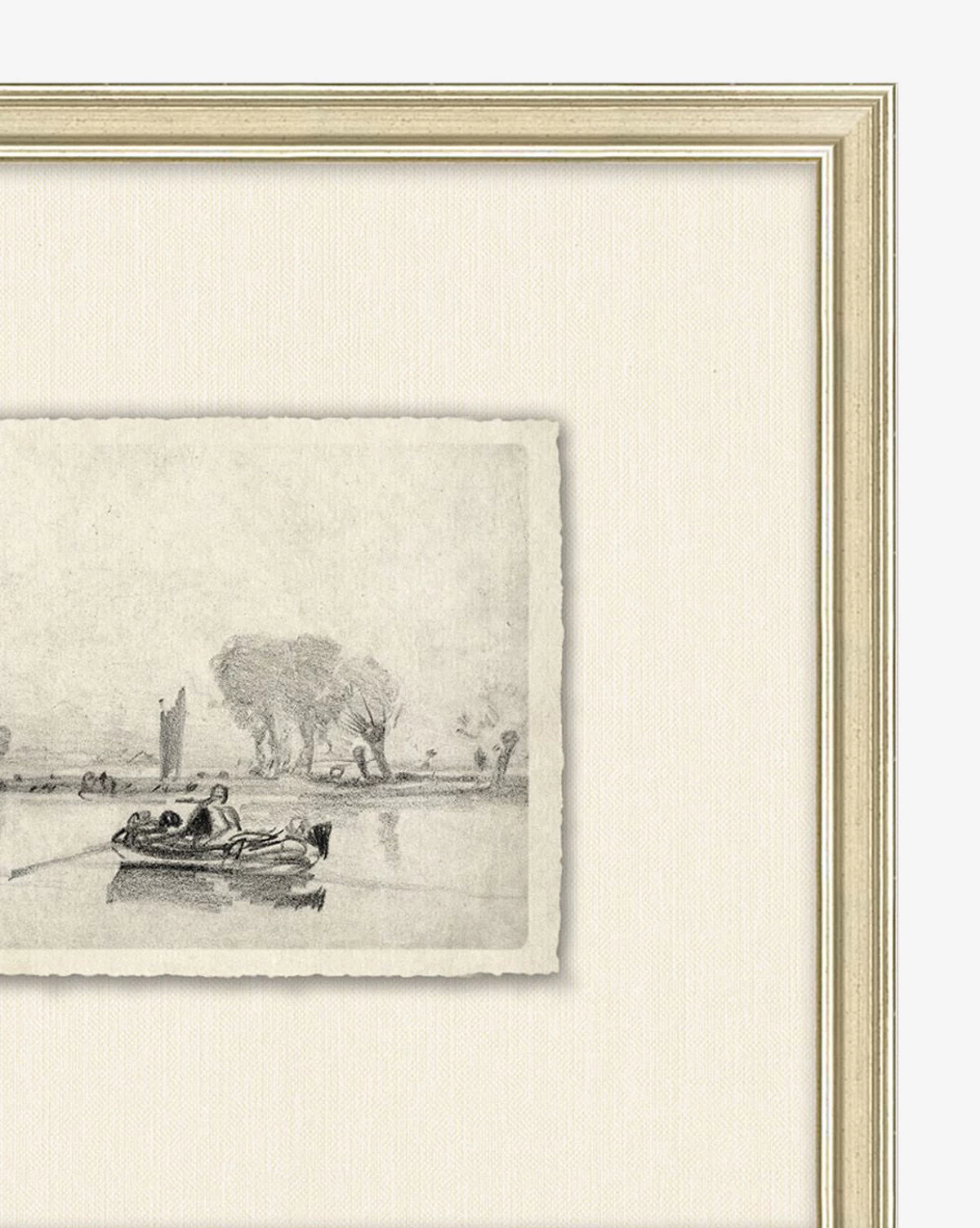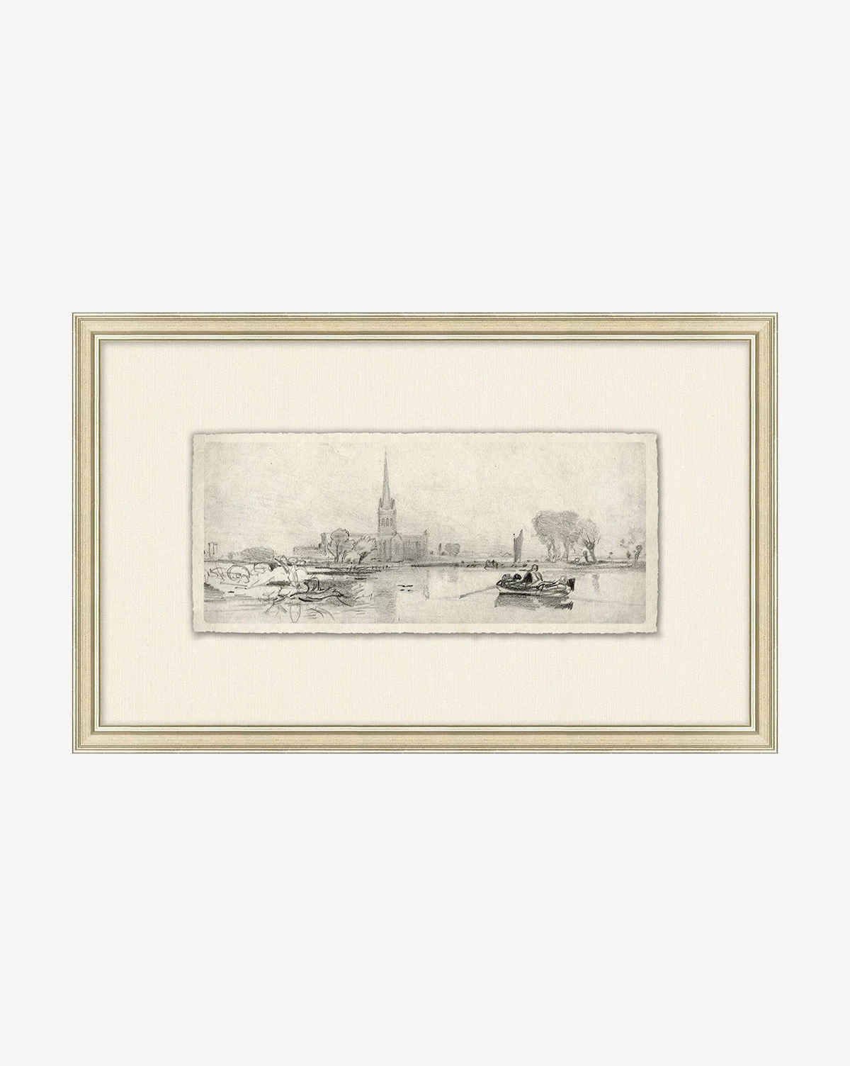 With a subtle composition, French Countryside V is inviting and intricate. The sketch depicts an expanse in nature before a quaint town, with intricate linework. Deckled and floated on a mat, the piece is framed by silver-finished wood. Â
