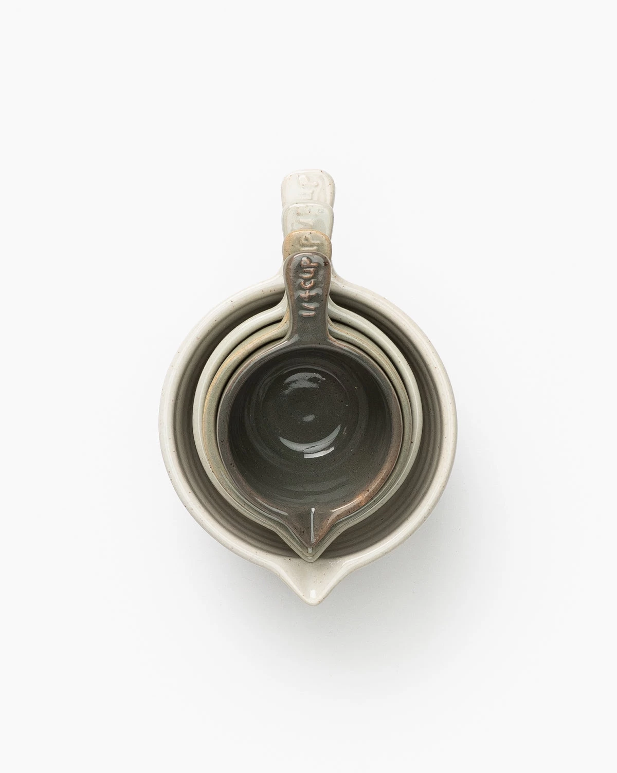 Crafted from stoneware and finished with a white glaze, the Fullmer Measuring Cups are a timeless kitchen treasure. Their simple aesthetic and functional handle and spout allow the measuring cups to be both a classic countertop detail and a trusted baking tool.
