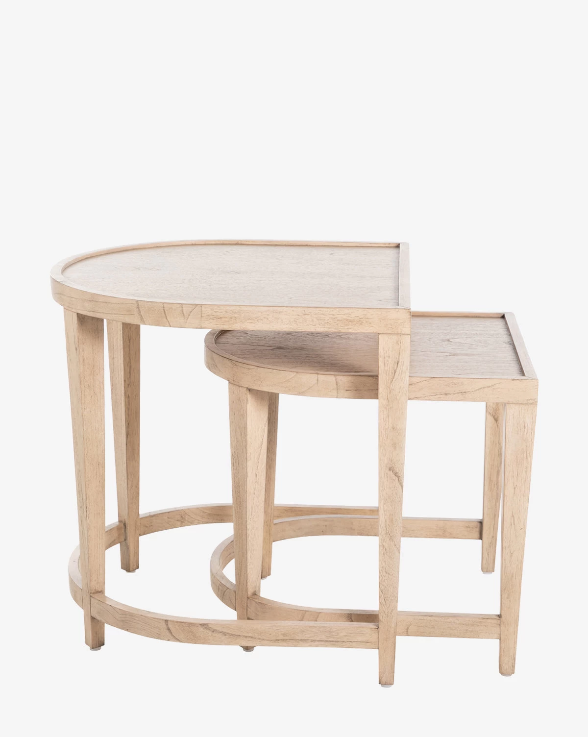Sleek and natural, the Gianna Nesting tables are made from mindi wood and feature wood graining details within their simple form. With both a round and straight edge, the unique shape of the nesting tables brings a modern element to your design whether placed under a console or styled by a sofa.