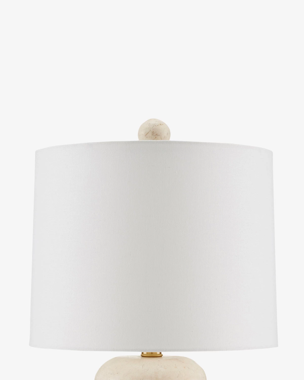 Balanced and sculptural, the Girault Table Lamp is made from beautiful travertine with a finial and hardware finished in antique brass. Its round and stacked base adds dimension to the bone linen shade, while the detail in the natural travertine brings organic texture to your decor.