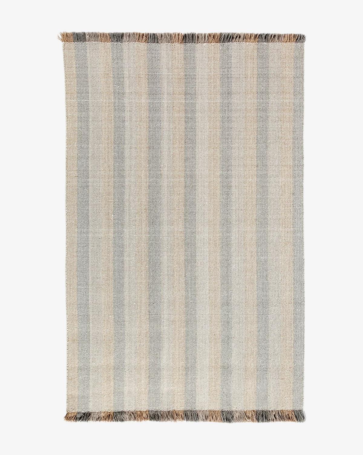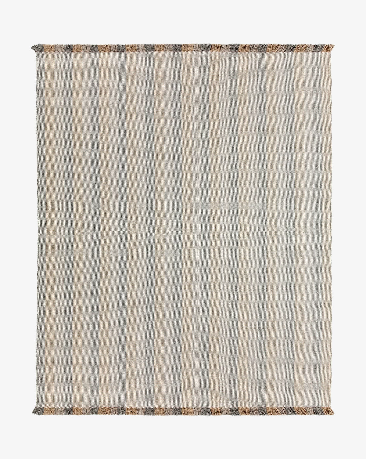Contrasted tones bring a playful quality to our eclectic Grandby Handwoven Wool Rug. In hazy, muted hues of rose, beige, and gray-toned brown, the rug itself has a handwoven striped design with fringe that extends this pattern in brighter, richer tones of the same palette.Â