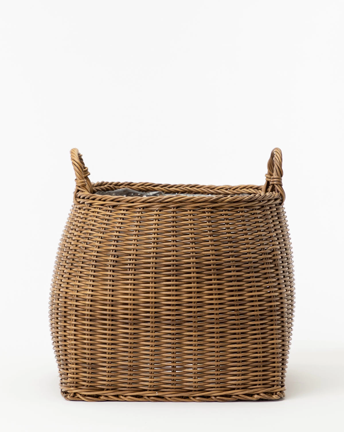 Intricately woven in poly-rattan, the Handled Planter Basket has a clever box design with rounded edges. Lined with a plastic insert, this piece is ready to handle small indoor plants or standalone as a textural addition to home decor.