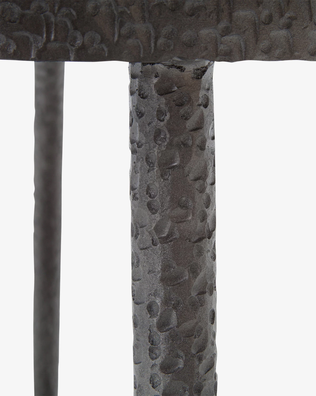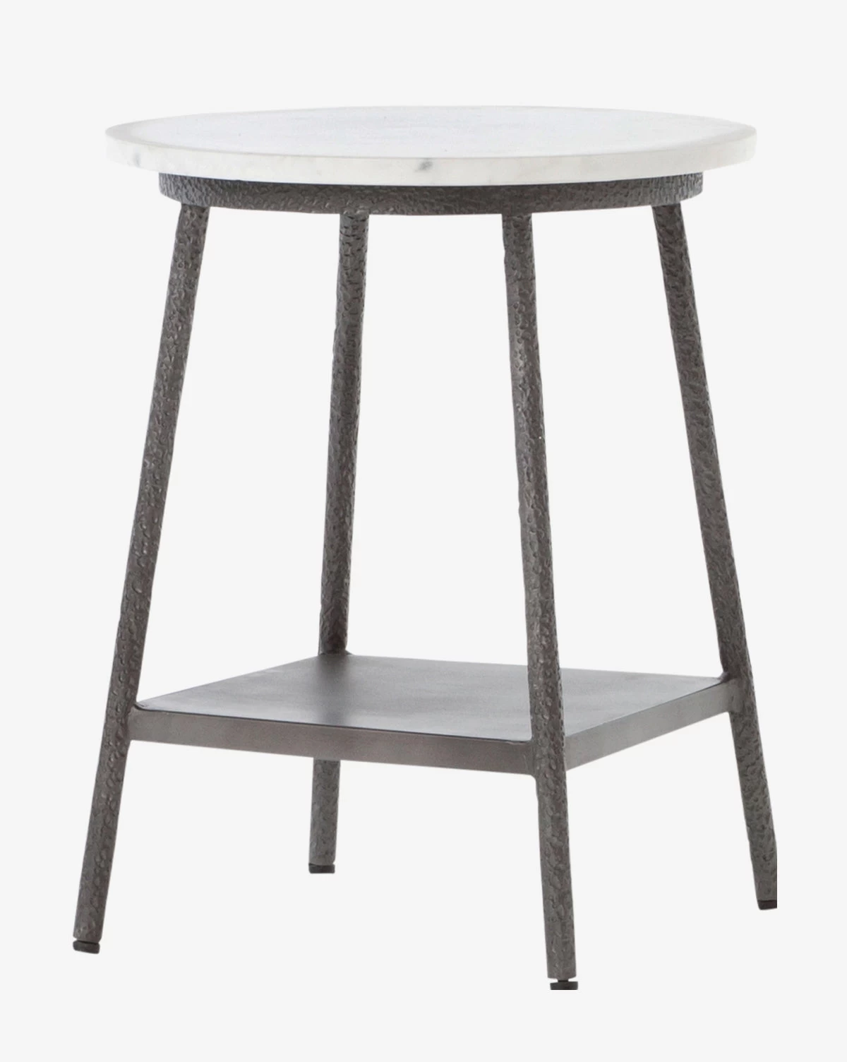 A simple silhouette gets an update with contrasting iron and marble materials. Our Heidi Side Table features a hammered gunmetal base with a hand forged feel and sleek white marble top.