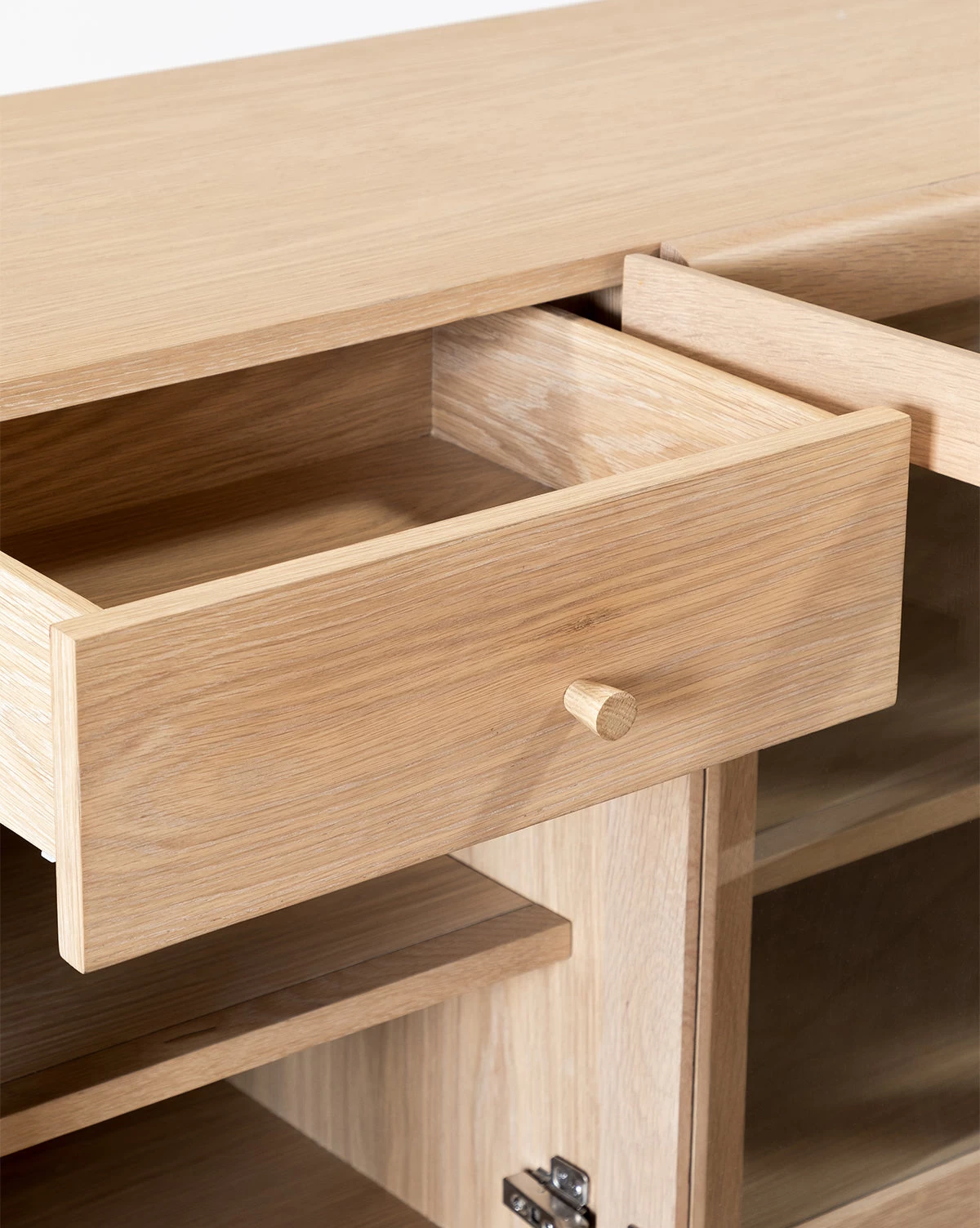 Dynamically designed, the Kensington Sideboard has a neutral, warm white oak finish and a stately form. All tucked inside beautifully framed glass doors, the shelving and drawers inside this elegant sideboard add dimension and are perfect for styling your more precious pieces.