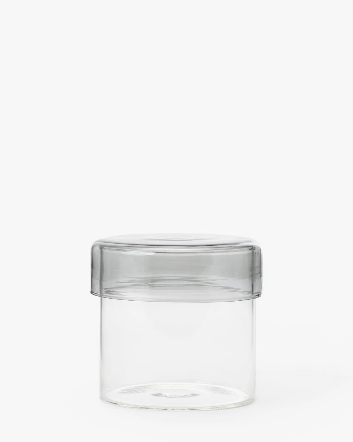 With a cool smoke color, the Kesey Glass Jar brings a sleek and modern element to your styling or organization. Its simple cylindrical shape and unique glass lid lend both function and personality to shelves and countertops.