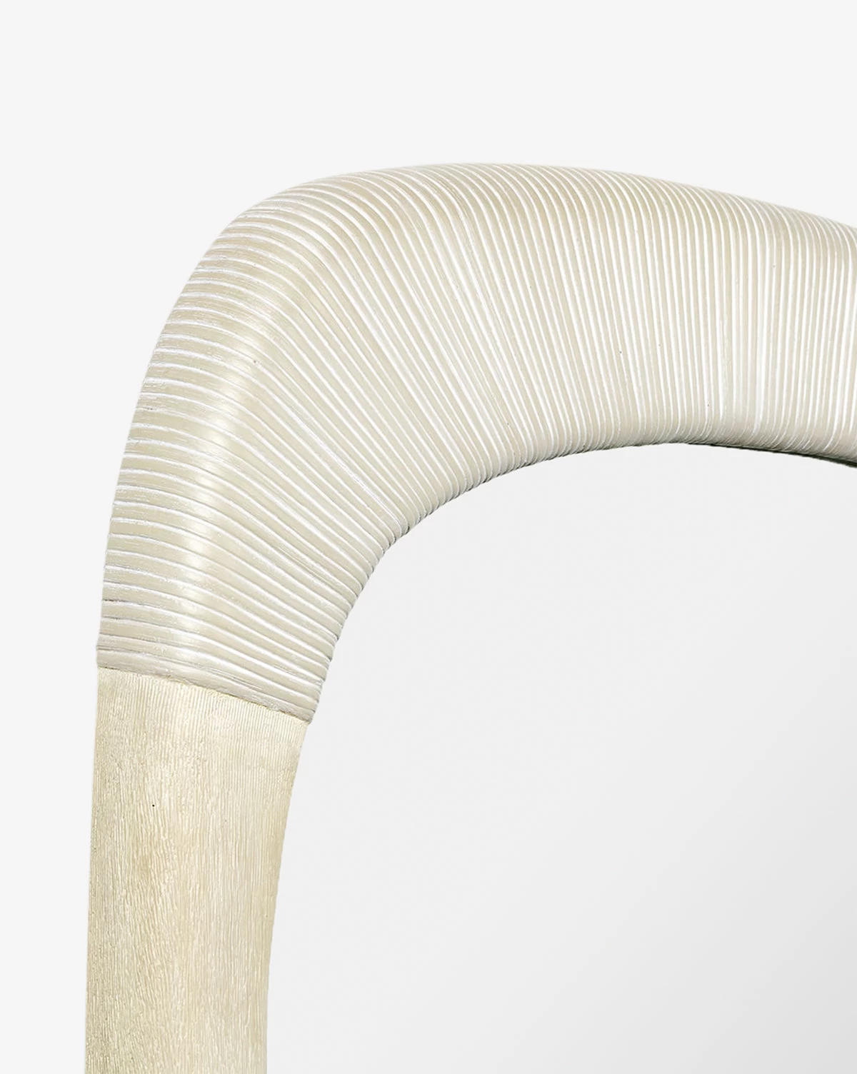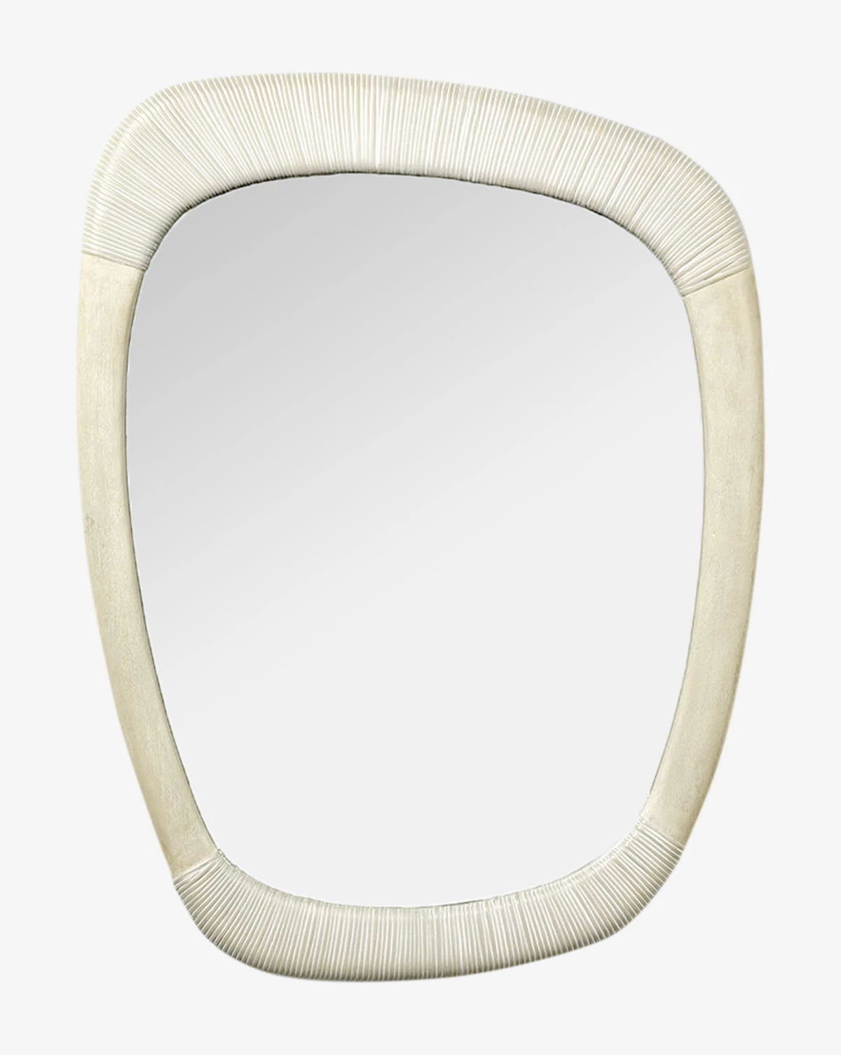 With a wood frame accented by wrapped rattan details, the Kipton Wall Mirror draws attention with its abstract shape. The thick frame in a khaki finish provides a subtly grounding feature among your decor whether styled in an entryway or bedroom.