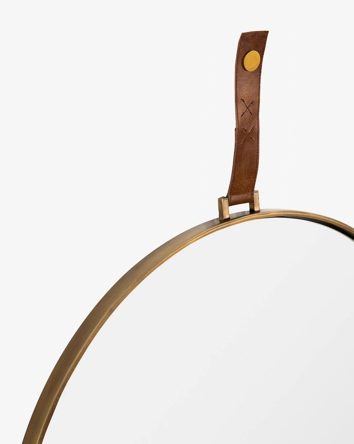 Designed with intentionally styled spaces in mind, from entryways to mantles our Laila Circle Mirror makes a statement with a classic material mix. From the genuine leather hanger and brass hardware, to the iron frame with a brass plated finish, this mirror is as versatile as it is beautiful. More than just a pretty shape, its shatterproof glass and moisture tolerance add to the functionality of the design.