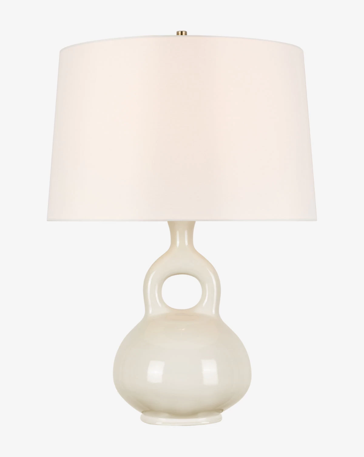 An abstract modern base brings a sculptural element to your space with the Lamu Table Lamp. Crafted from glazed ceramic in either a mixed blue and brown or an ivory finish, the wide linen shade complements the intricate structure of the lamp and provides a functional accent piece for a console or side table.