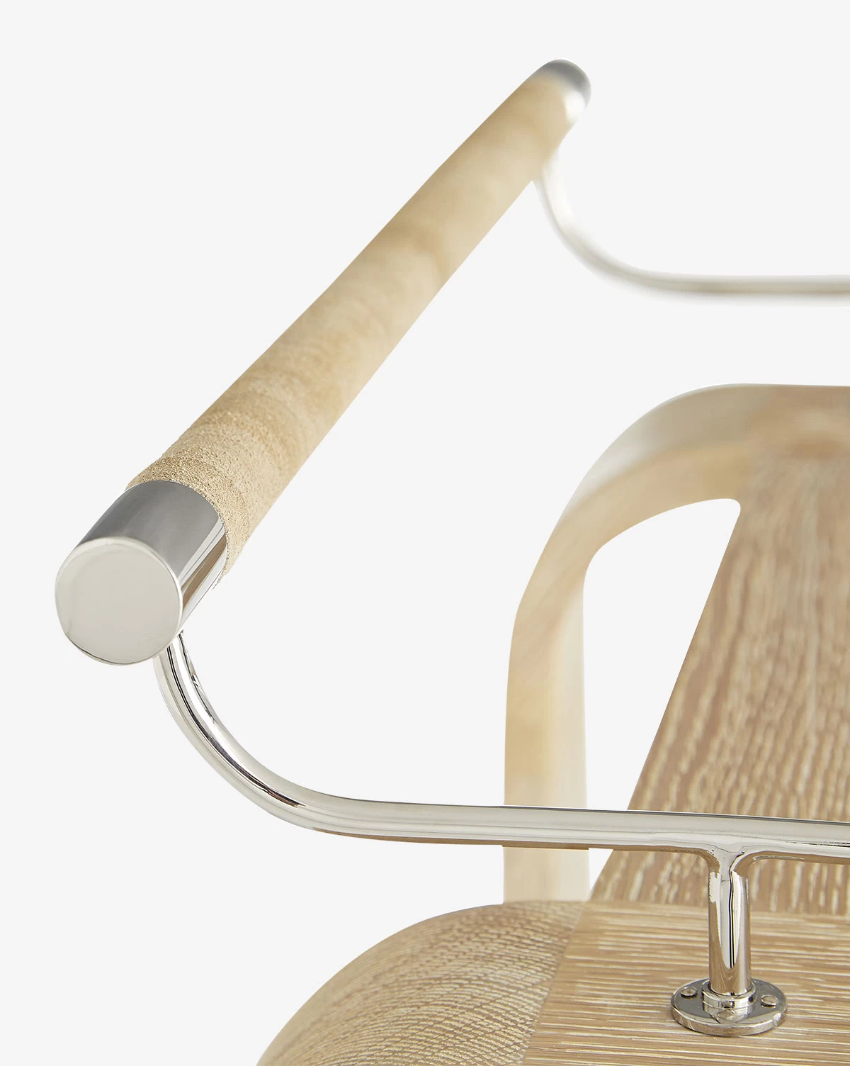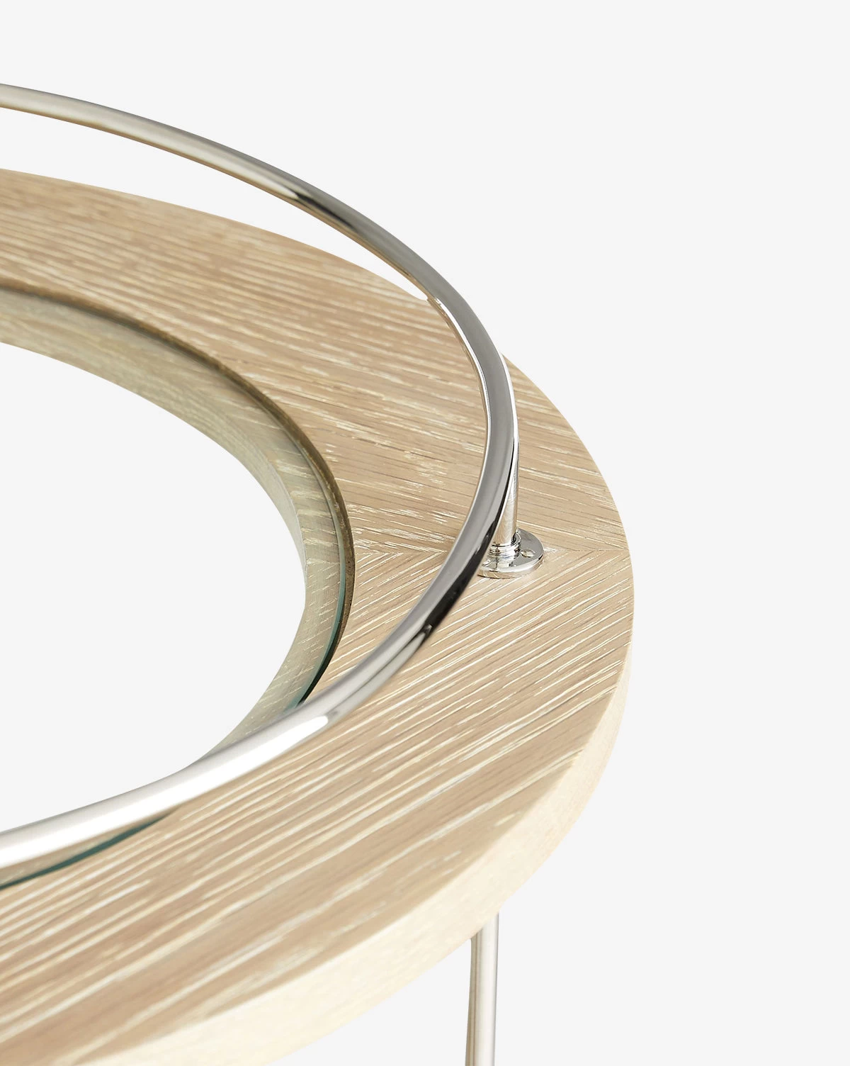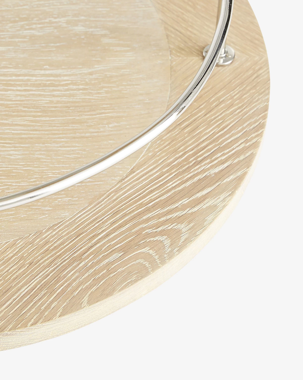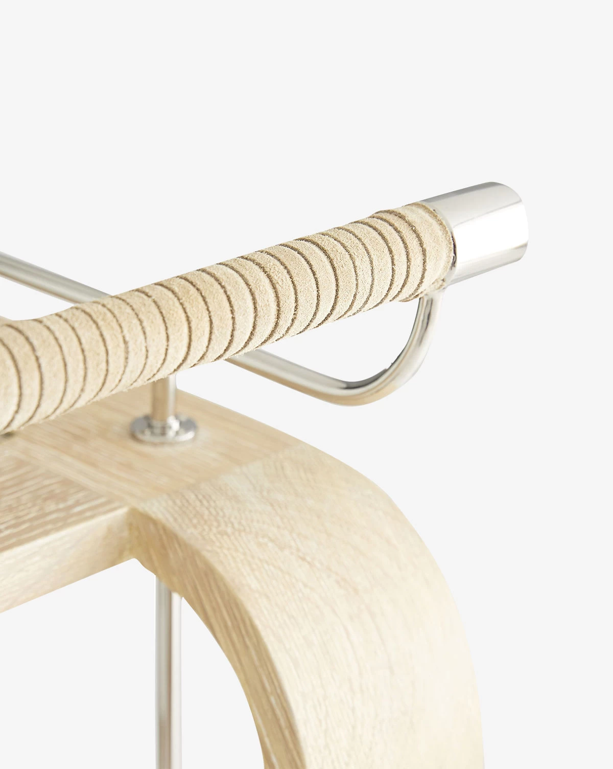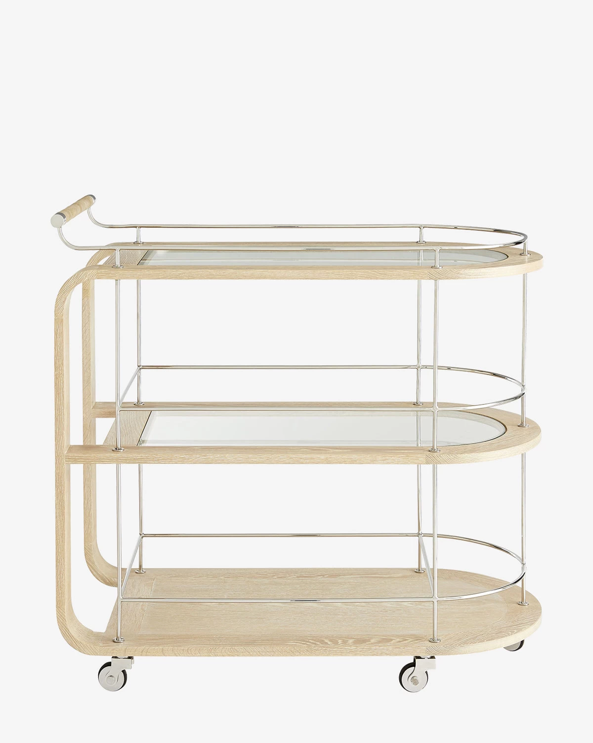 Inspired by a vintage New York hotel bar cart, the Mangum Bar Cart is intricate and shapely. Its frame is made of bleached oak and features a leather-wrapped handle with two inset glass shelves. Its three tiers and layered materials bring elegant function to any hosting occasion.