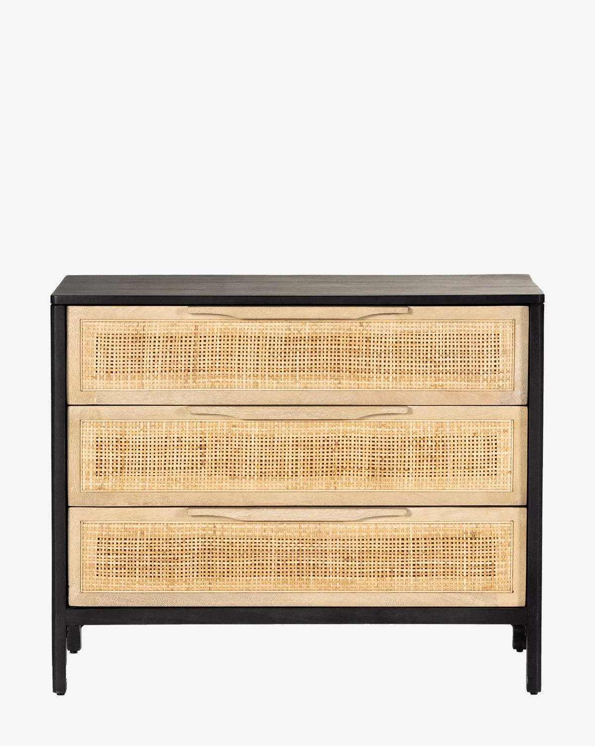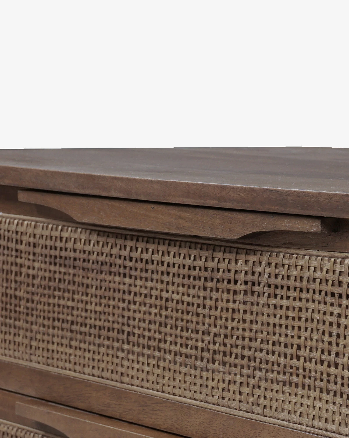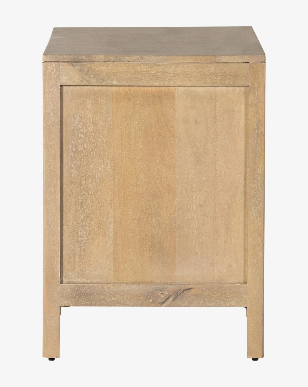 Crafted from solid mango wood, the Margaery Nightstand beautifully mixes materials in a simple design. Subtle details elevate the presence of this nightstand, with the smooth frame contrasted by three inset woven cane doors.