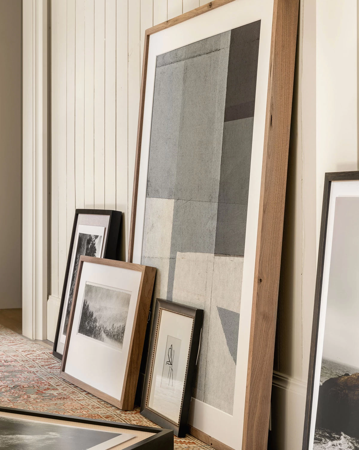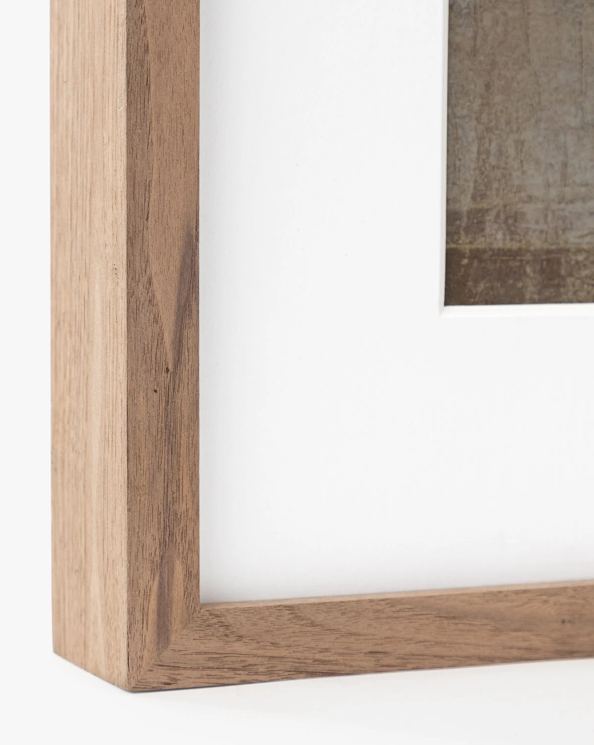 In a composition that embraces shape and texture, Mixed Layers is a giclee print on museum-grade paper. Presented within a rustic walnut frame, the abstract piece by Dan Hobday evokes a sense of movement and tranquility.