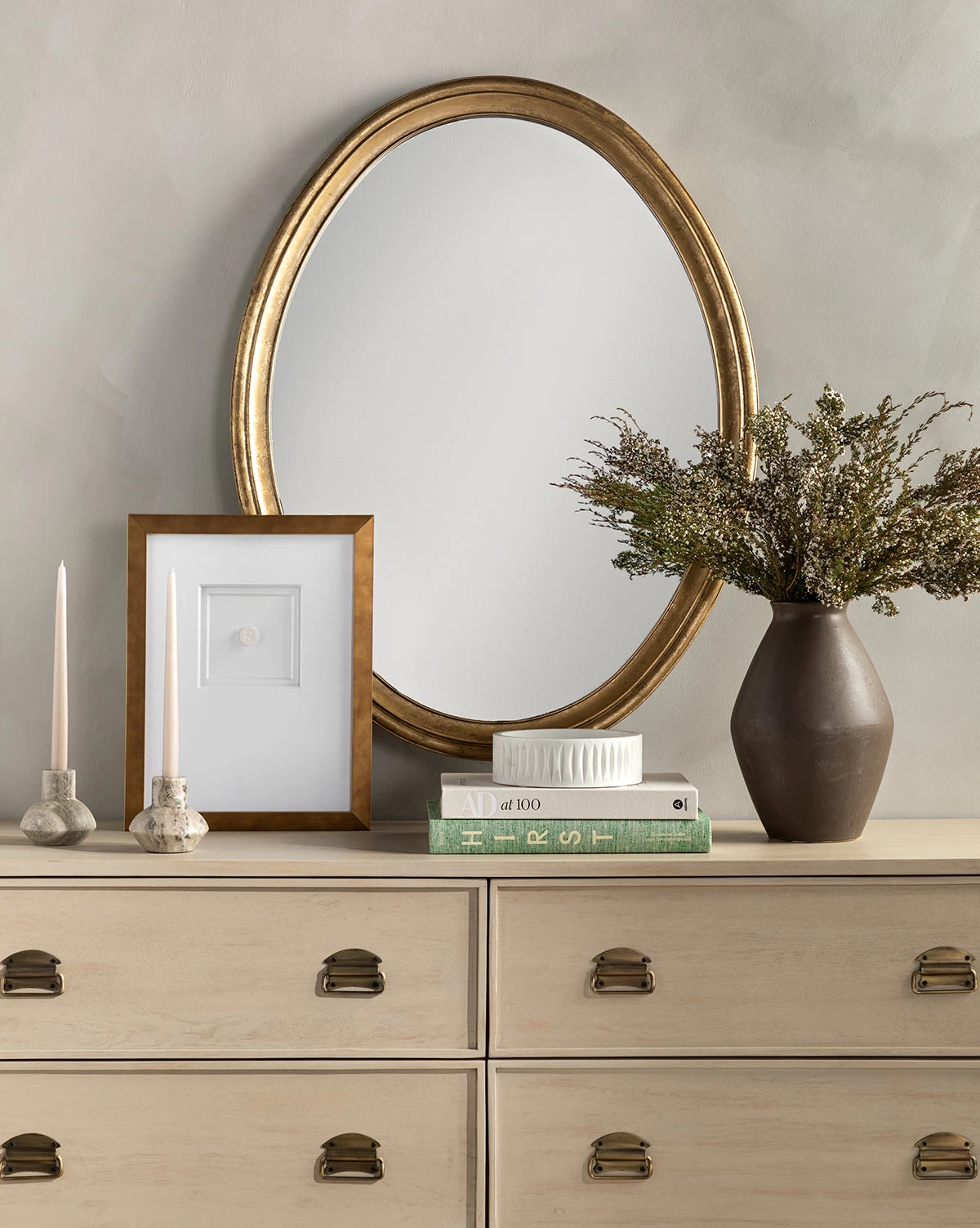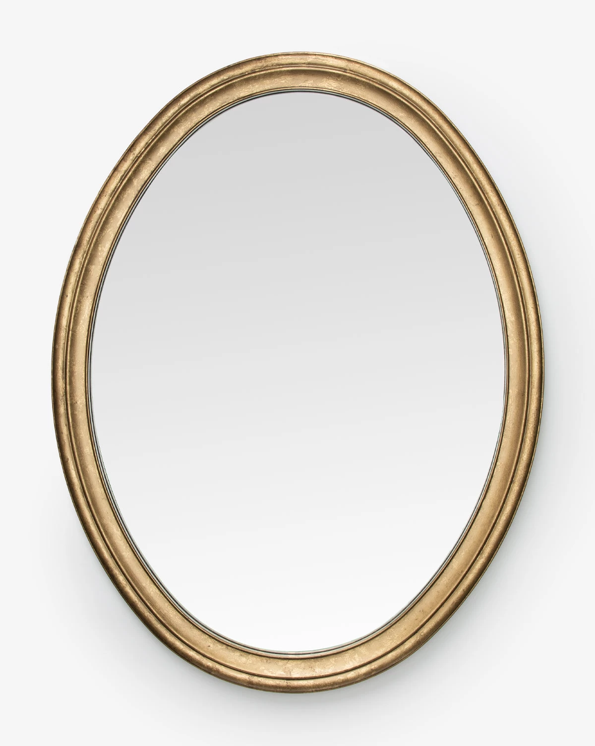 Designed with an oval frame in a traditional style, our Mona Oval Mirror has a bold presence that brings dimension to your space. Its gold leaf finish brings a warm and vintage feel to your decor and its simple shape allows for versatility in its styling.
