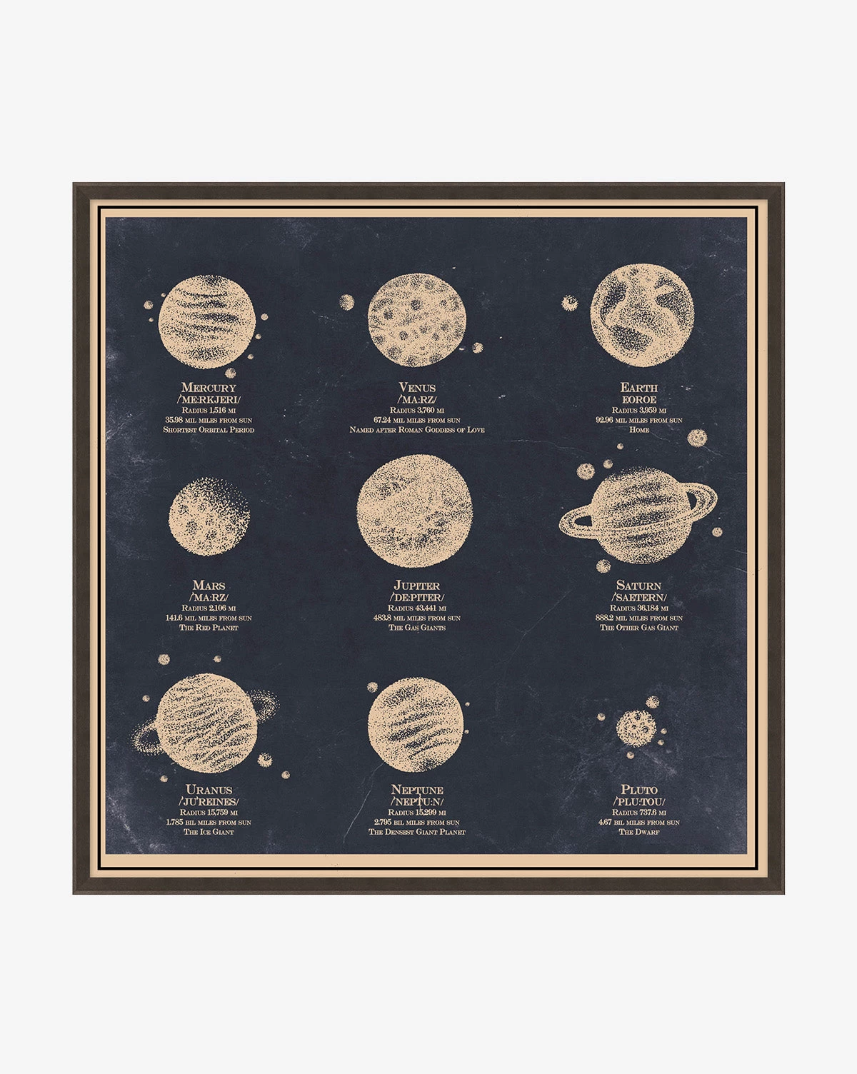 ï»żThe Nine Planets Diagram has a really endearing vintage-inspired feel. A giclee print on canvas, this artwork is mounted on wrapped hardboard in a black wood grain frame. Its warm design is charming, bringing an inviting feel to childrenâs room. Â