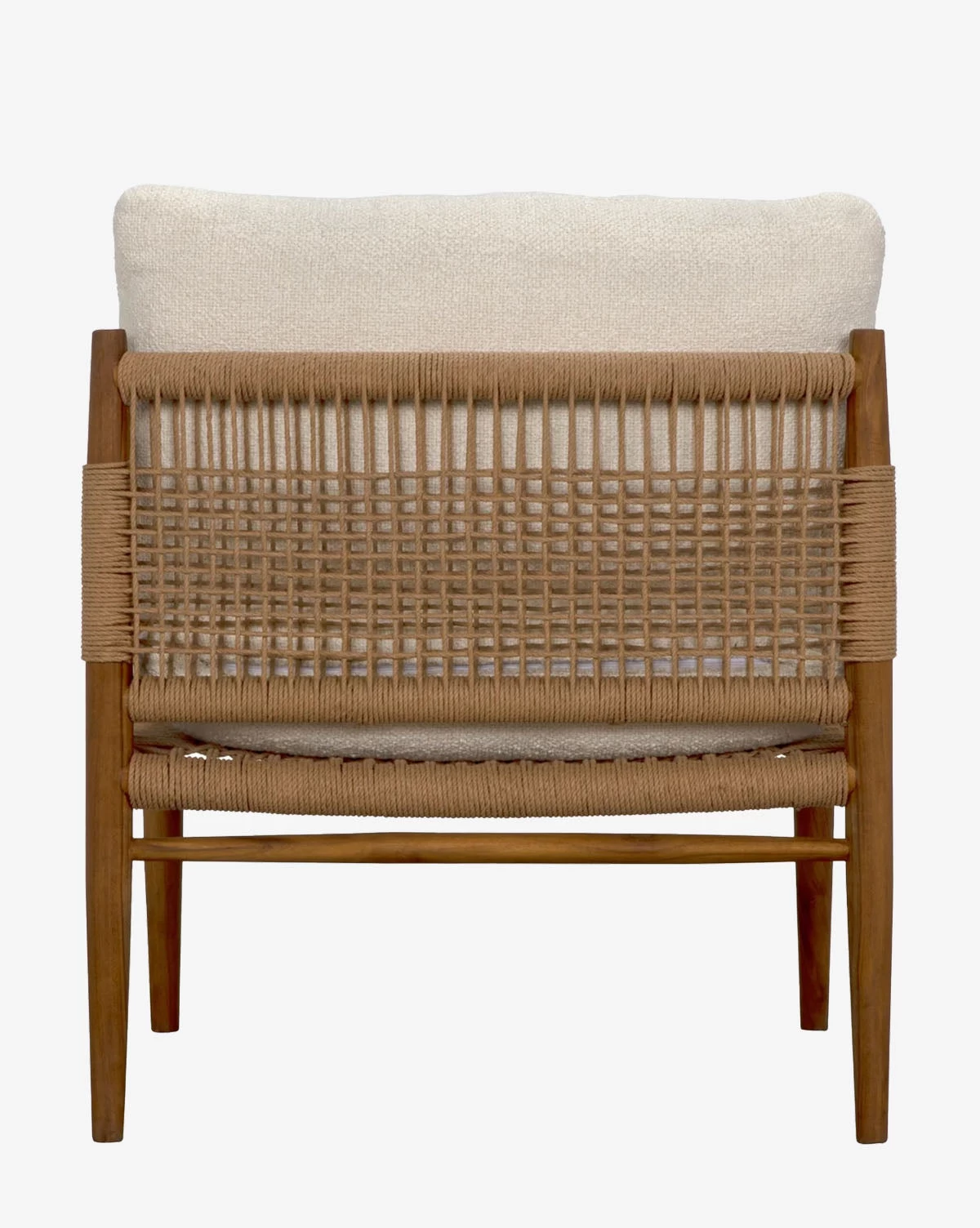Comfortable and timeless, the Oakley Lounge Chair is crafted from natural teak with a rope seat and back. Its beautiful frame holds cushions upholstered in a boucle style fabric, creating an inviting feel wherever it is styled.
