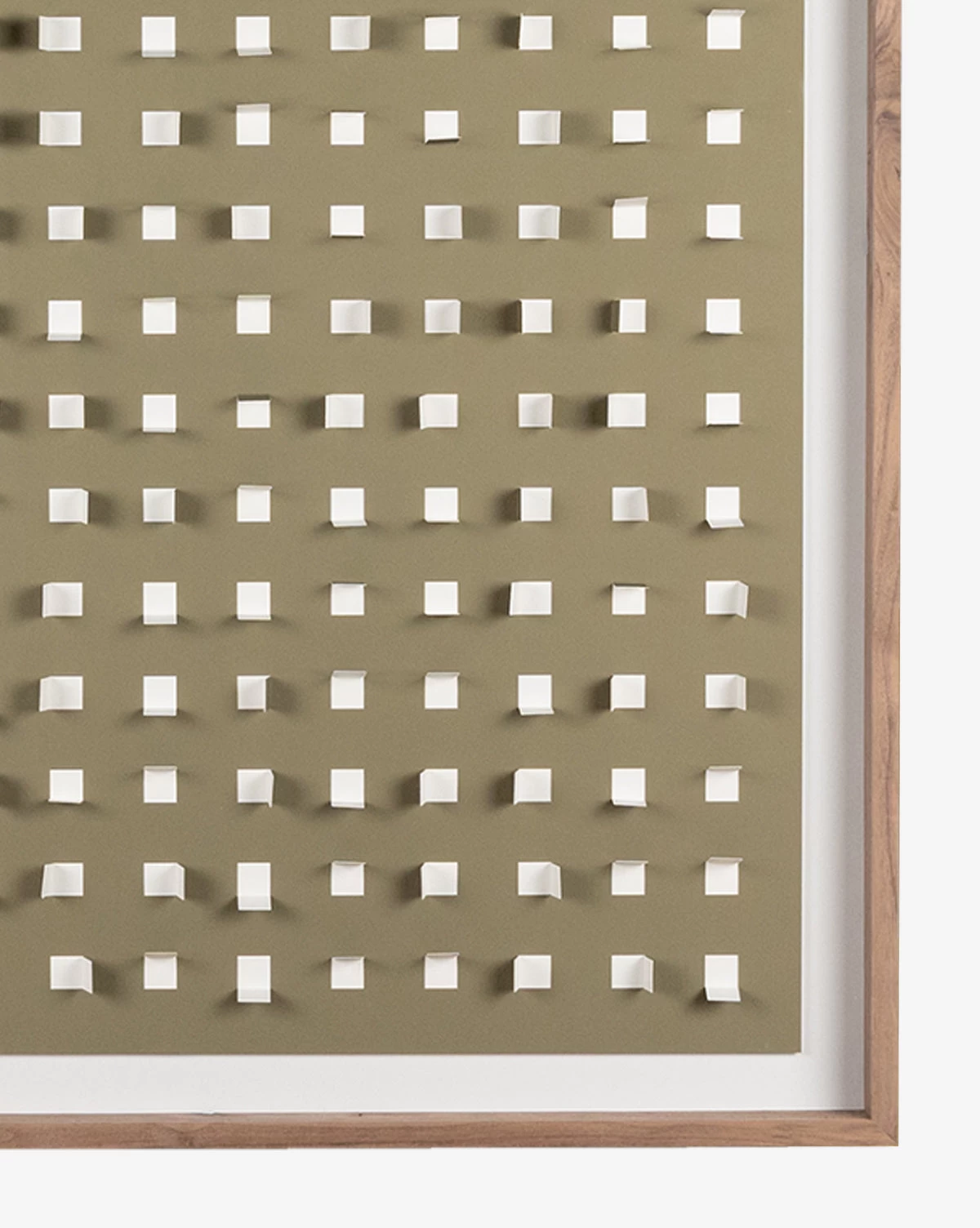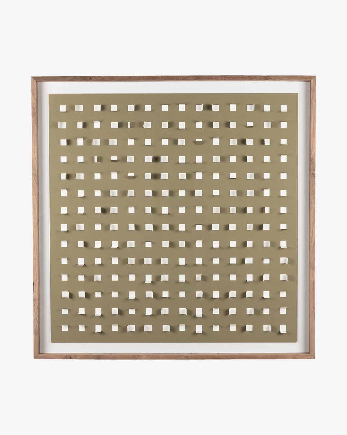 Playful and contemporary, Olive Grid is a textural art piece created with olive green paper cutouts atop a neutral background. Displayed within a walnut frame, the artwork brings museum-quality materials to your decor.