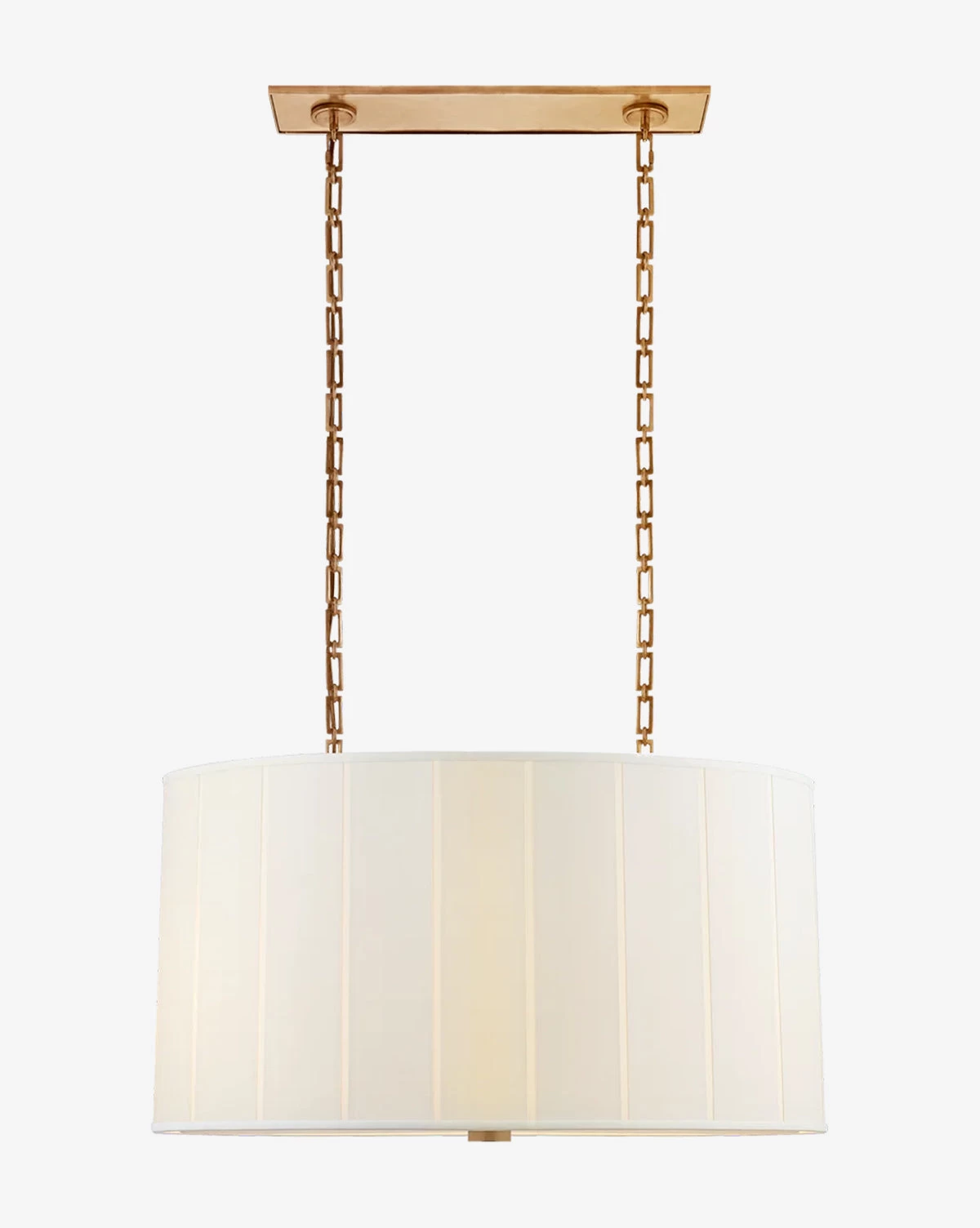 The Perfect Pleat Oval Hanging Shade uses simple yet new design elements to its advantage. Â Suspended from two, instead of one, chain brings a new sense of modern and balance to the typical pendant light. Â Its rectangle linked chains are the perfect pair with, as its name suggests, a perfectly pleated shade.