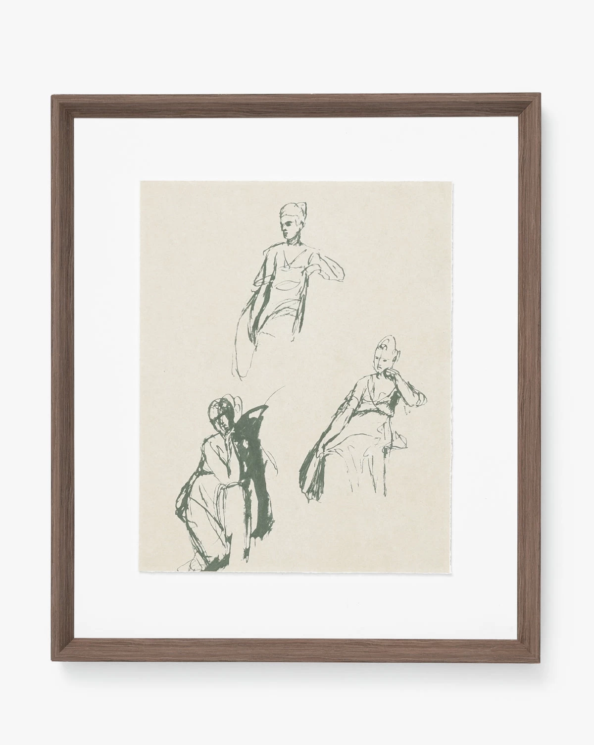 With delicate brush strokes and a sketch-like feel, Portrait Views shows the beauty of art in progress. With a wood frame in a walnut finish, the giclee print on watercolor paper is hand deckled and floated on a mat.
