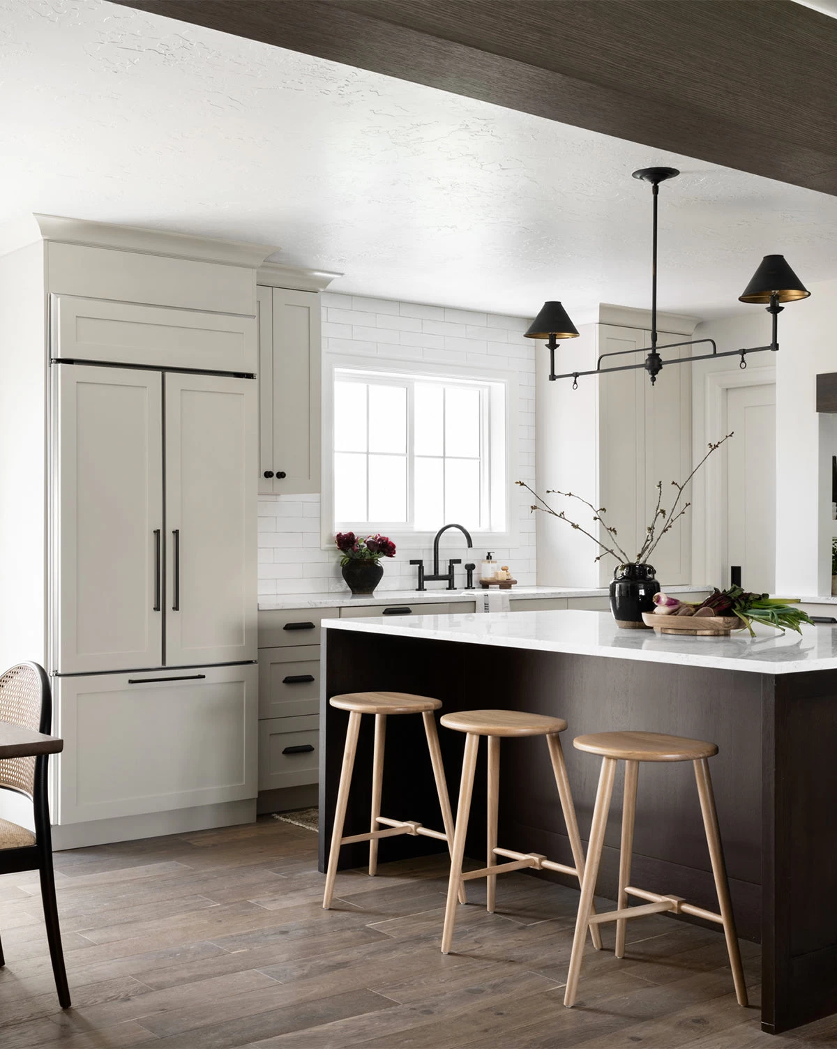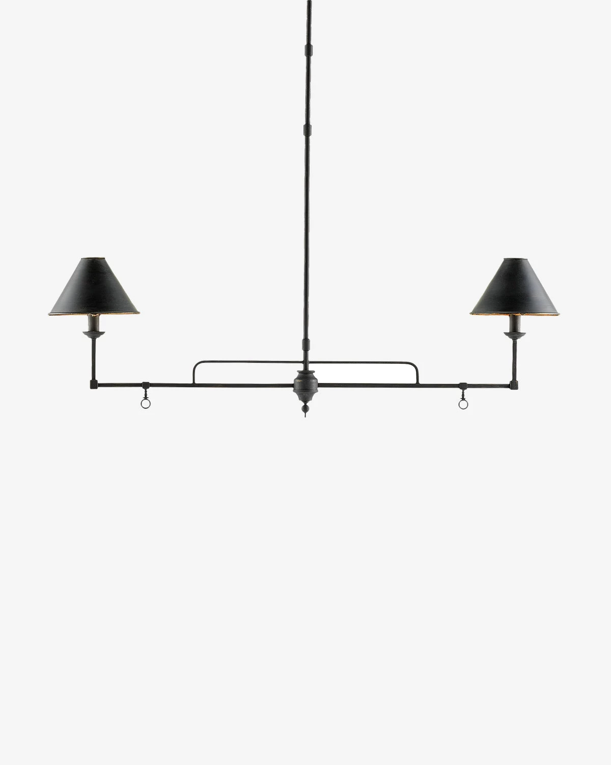 A traditional oil lamp design gets a modern update with sleek, rectangular framing in the Prosperity Rectangular Chandelier. Its shades are lined in gold leaf, bringing opulence to its illumination, and is finished by hand to give unique variance to every chandelier. Finished in French black in a brushed technique, this fixture has a rustic feel that lends a warm, lived-in quality to your space.