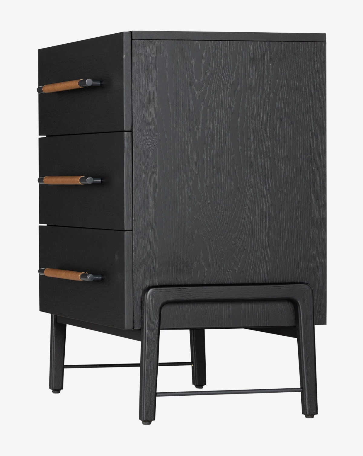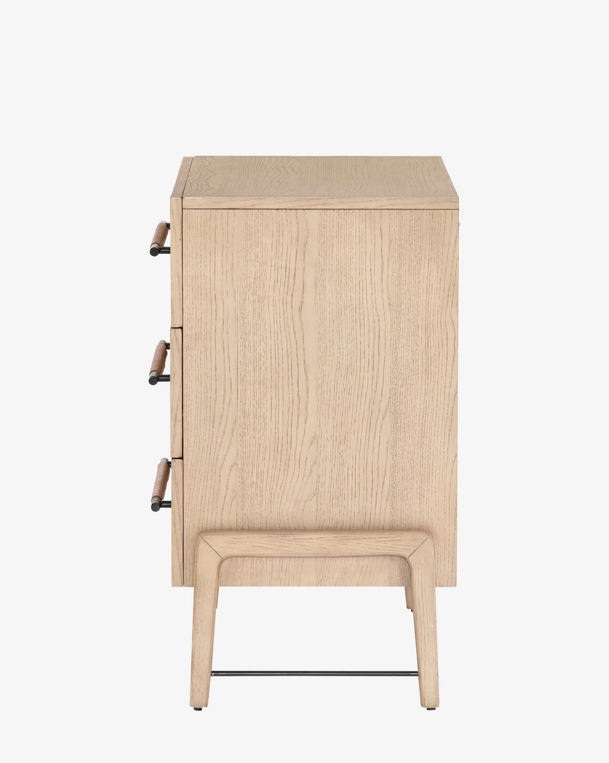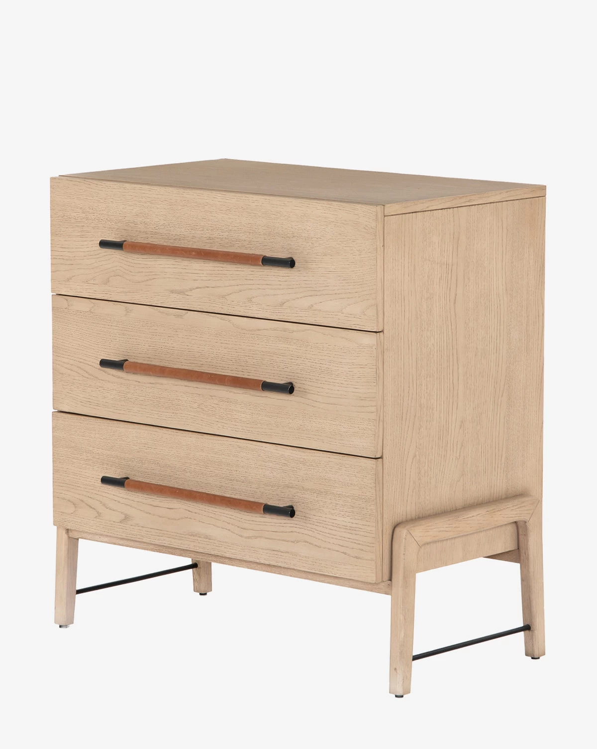 Featuring a stunning material mix, the Ralston 3-Drawer Nightstand brings both form and function to your bedroom design. Crafted with an oak frame, this nightstand is finished with iron hardware wrapped in tan top-grain leather creating a sophisticated look and feel.