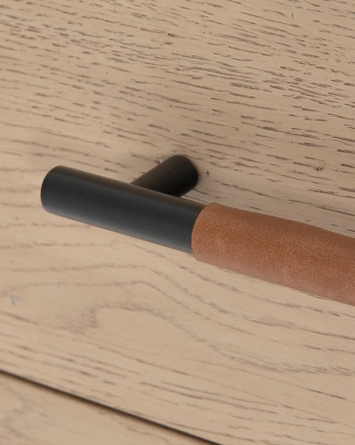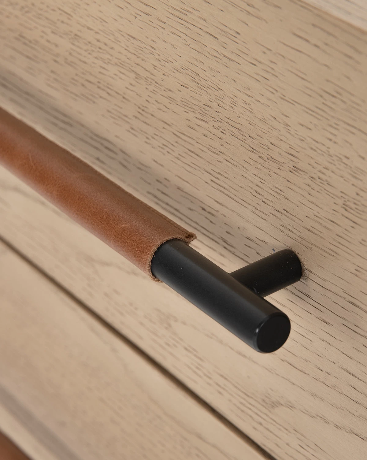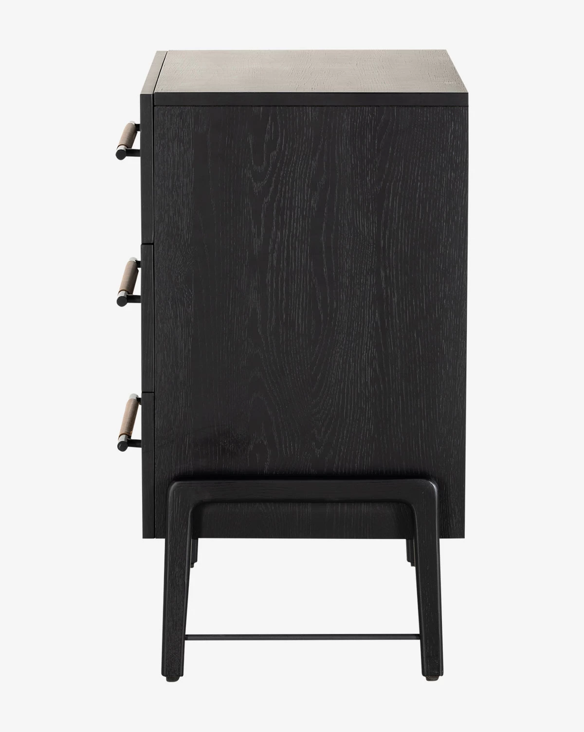 Featuring a stunning material mix, the Ralston 3-Drawer Nightstand brings both form and function to your bedroom design. Crafted with an oak frame, this nightstand is finished with iron hardware wrapped in tan top-grain leather creating a sophisticated look and feel.