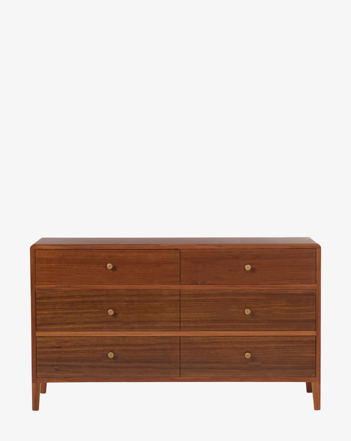 In an updated traditional design, the Renata 6-Drawer Dresser draws the eye with its organic details and tapered legs. Crafted from teak, this casually approachable design is finished with hammered brass circular pulls, lending a unique moment of visual contrast.