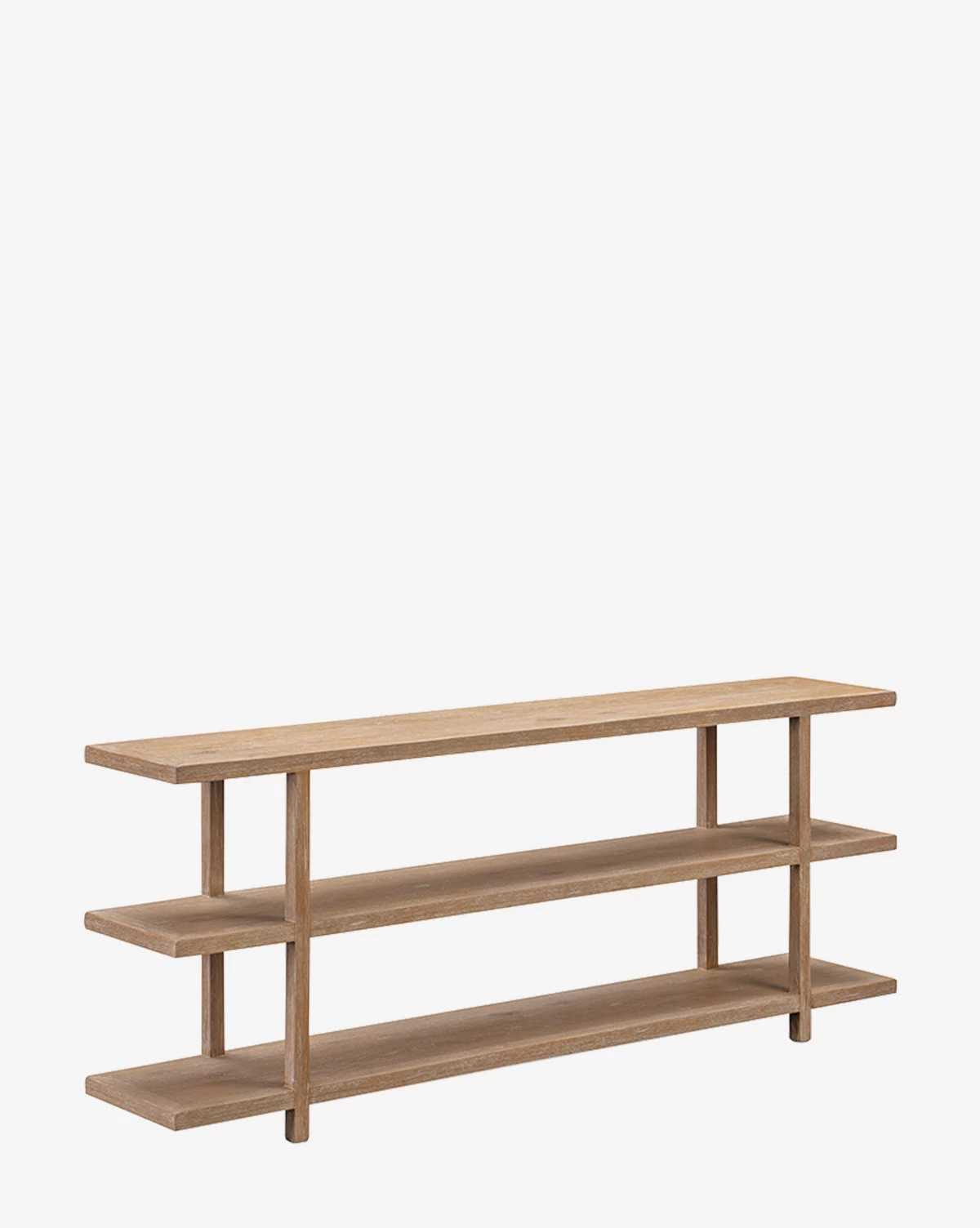 With plenty of shelving and a straightforward, clean style, the Renee Console is crafted from oak. Inspired by the Ming style in 16th-century China, this piece has a rectangular framed top, two additional shelves, and four squared support posts.