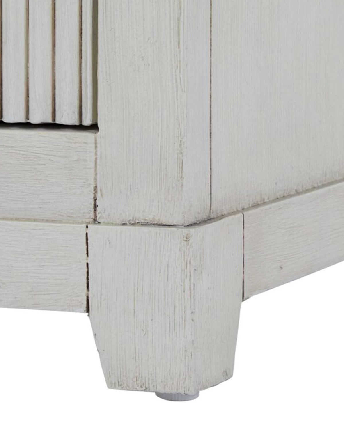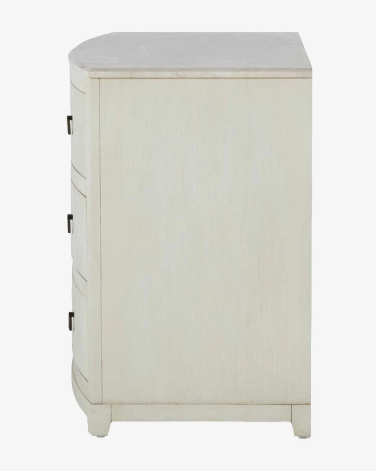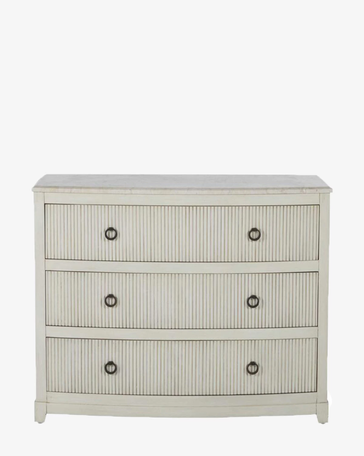 Bringing detail to classic chest design, the Renlie White Chest has a solid marble top to complement the antique ivory cream finish on the wood. The reeded drawers provide subtle texture and the round antique brass pulls lend a traditional detail to your space.