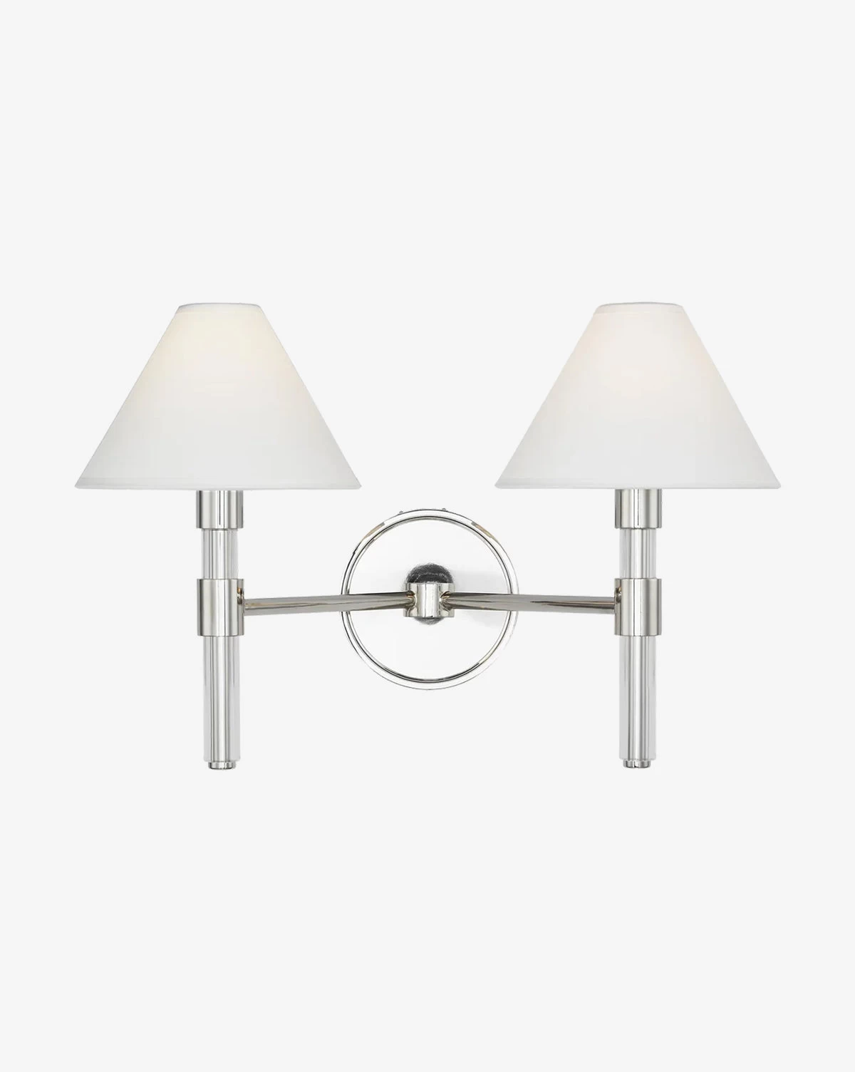 With a timeless, streamlined feel, the Robert Double Vanity Light puts mixed materials on display with its sophisticated form. Featuring a base finished in either a time worn brass or polished nickel, acrylic detailed arms accent the simple frame, adding a refreshing aesthetic to your home design.