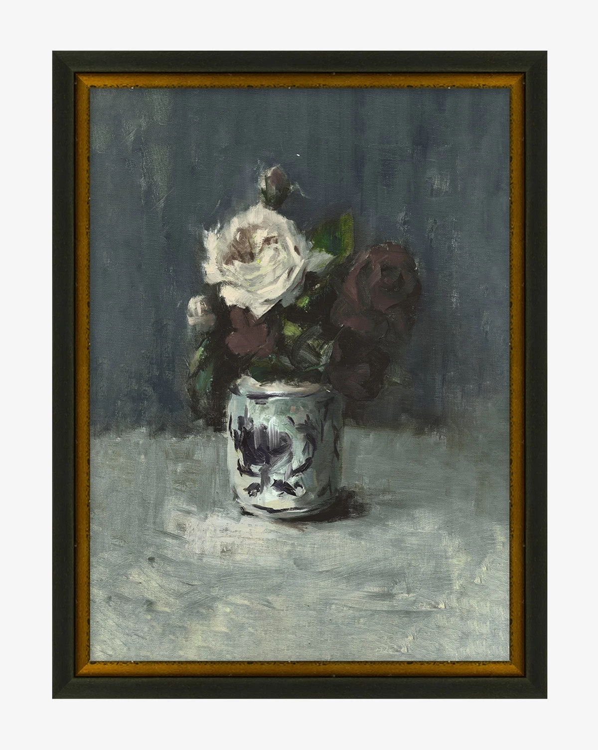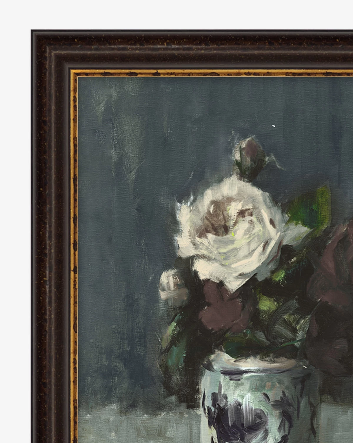 ï»żIntentionally moody in a muted, rich palette of cream, blue, and burgundy, Roses is an eye-catching still life. Produced with museum-quality materials and framed in a classic wood frame, this piece is a beautiful way to punctuate a space with a grounded, warm feel. Â