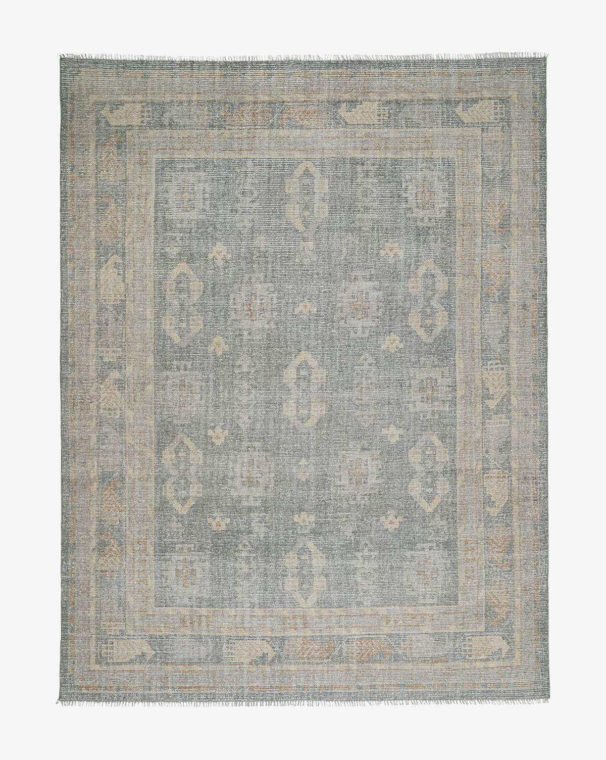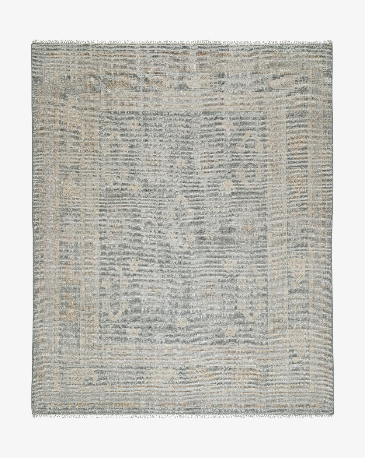 ï»żHand-knotted from wool in a muted palette of tonal greens, the Roslin Hand-Knotted Wool Rug features a familiar pattern that leans into a geometric style. Its crisp design is intricate and approachable, with contrast given by varied hues and shapes that lend motion to the textile. Â