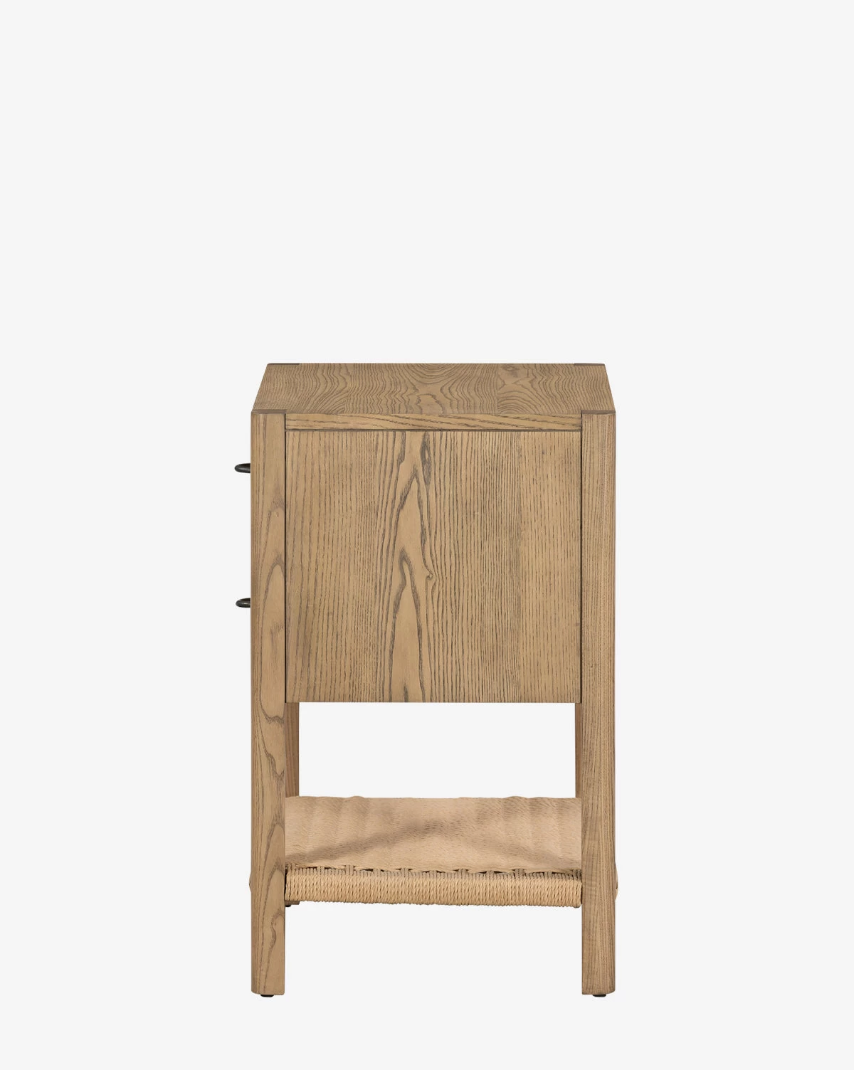 Crafted from solid ash, the Sequoia Nightstand is inspired by Danish design. Its subtle details elevate the simple presence of this nightstand, with the unique iron drawer pulls and the stretcher-style bottom shelf made from woven paper cord. Its two spacious drawers allow for elegant functionality in your bedroom decor.