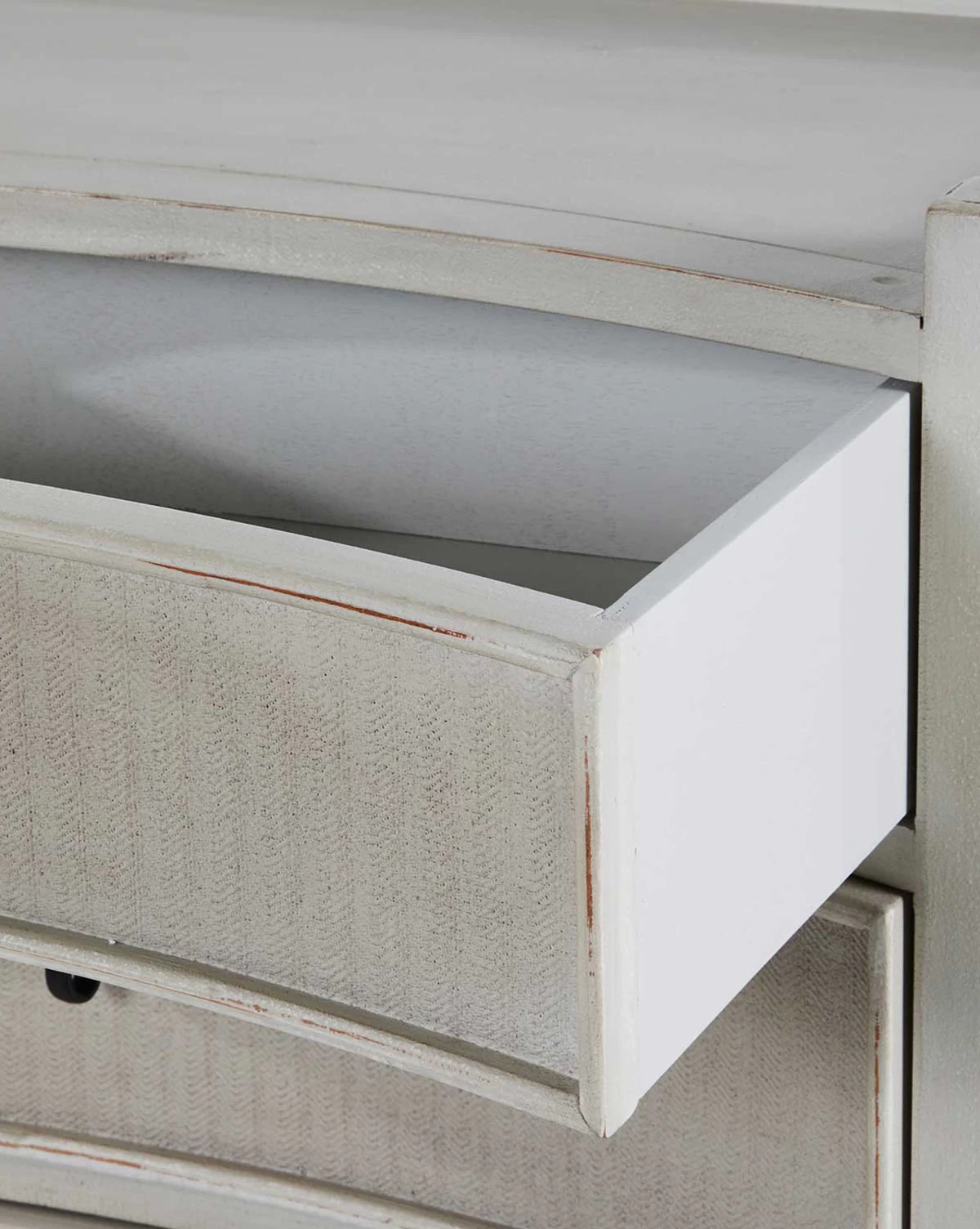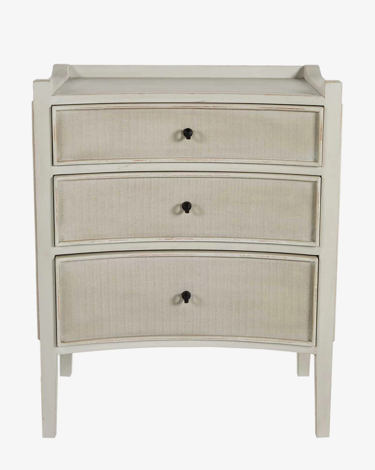 Made from oak, the Shai Chest is simple in style and features drawers ascending in size. With a curved front and shaped top border, the structure of the chest adds intriguing dimension. Burlap fabric covers the front of each drawer for added texture and character.