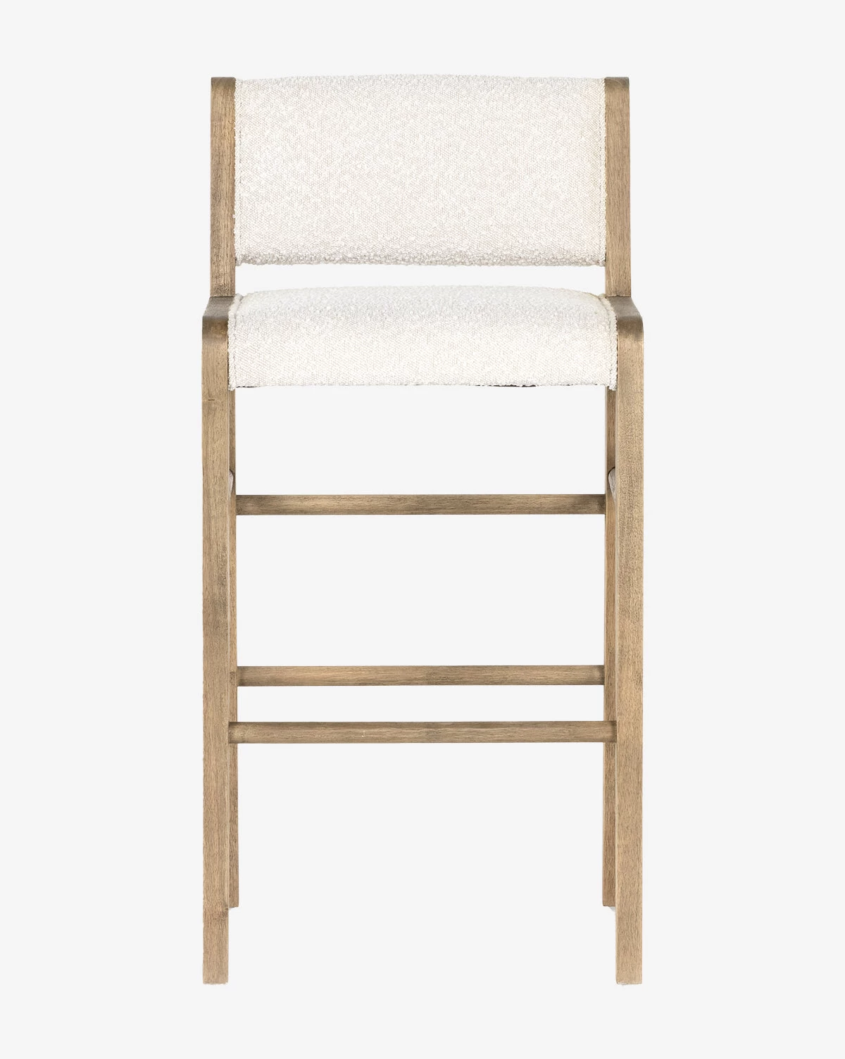 Upholstered with textural cream boucle, the Silva Stool is inviting and gives a refreshed feel to the classic bar stool. Angled lines and smooth joinery lend a fluid motion to the structure of the stool, and its thoughtfully placed dowels create stability and nuance. With a padded backing and seat, the Silva Stool is modern and comfortable.