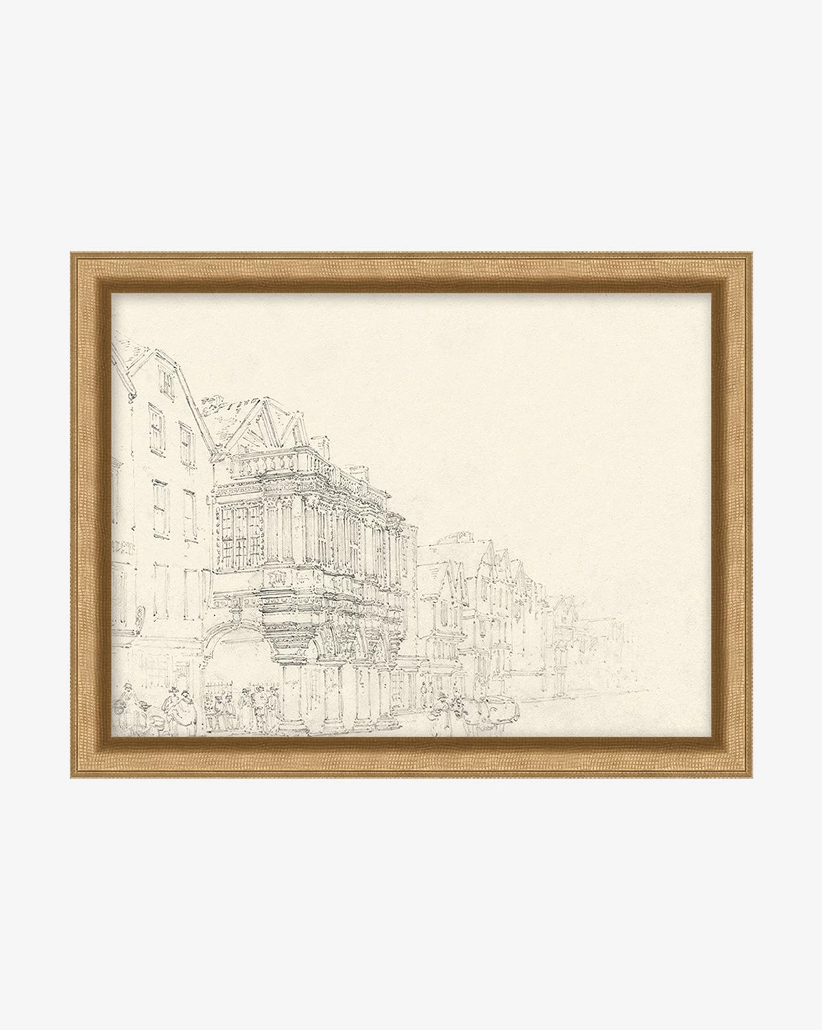 With subtle linework, Sketched City Street has the feel of a vintage architectural sketch. The sketch depicts the historic Guildhall in Exeter, England with its renaissance-era architecture and grand scale. A giclee print on matte paper, the piece is framed with gold-finished wood. Â
